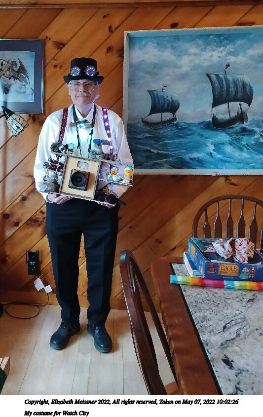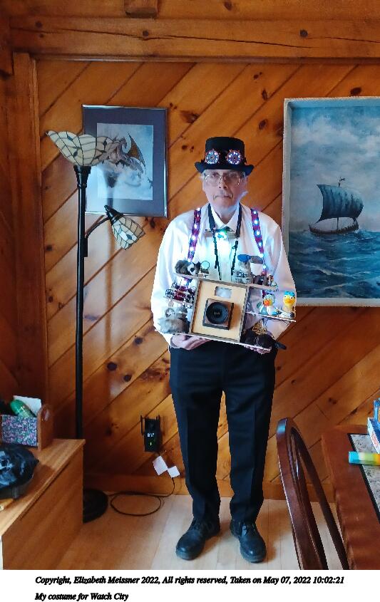 Picture #5: My costume for Watch City #3 Small: 533x845, 87,025 bytes (85K), (html file) Large: 2000x3000, 2,999,728 bytes (2.9M), (html file) Copyright, Elizabeth Meissner 2022, All rights reserved Samsung A32 5G phone f/1.8, ISO 1000, 1/20 sec, 4.6mm, auto mode, center weight metering 35mm equivalent focal length 25.0mm Programs used: gimp, rotate right Taken by Elizabeth Meissner on May 07, 2022 10:02:26 Last modified on May 29, 2022 at 16:59 |