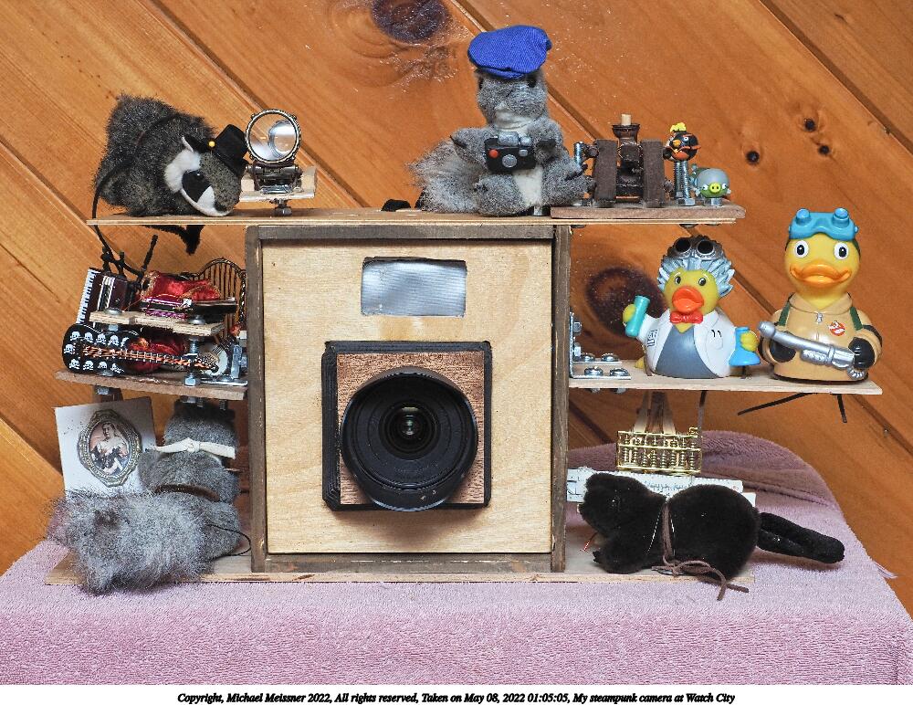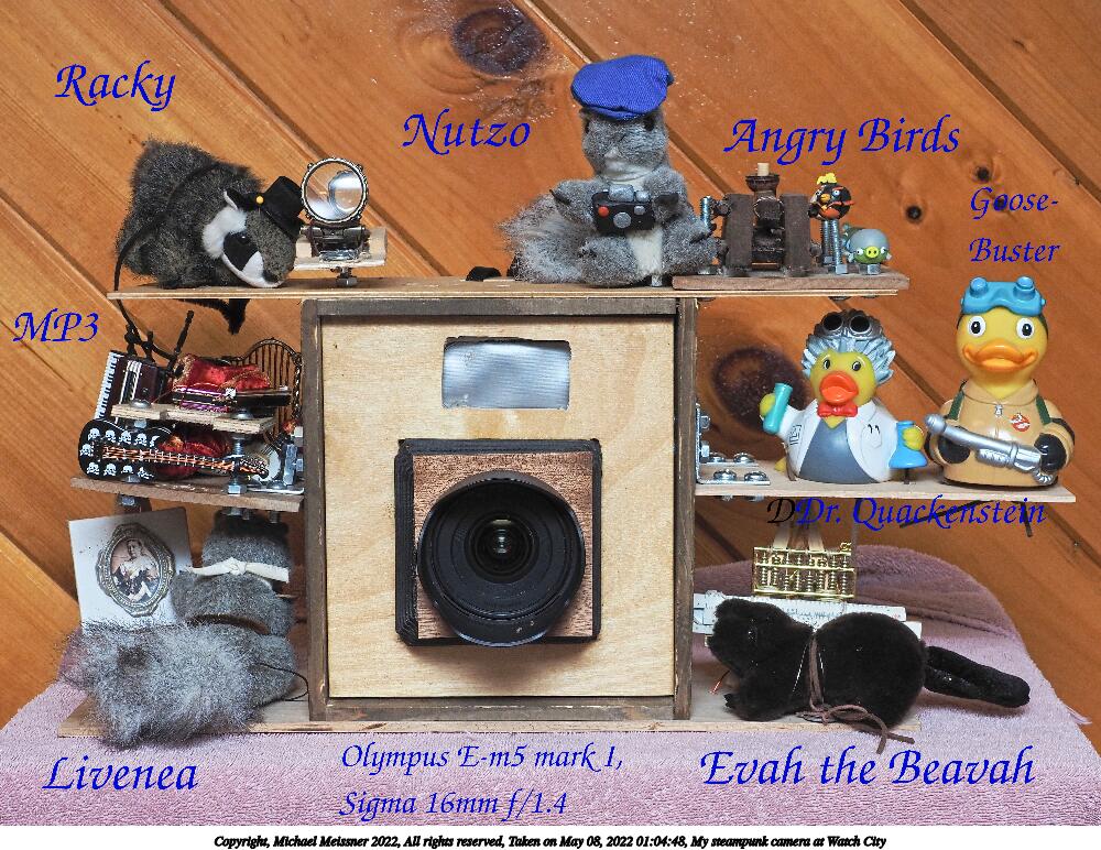 Picture #2: My steampunk camera at Watch City #2 Small: 1000x772, 218,962 bytes (214K), (html file) Large: 4000x3000, 11,366,453 bytes (11M), (html file) Copyright, Michael Meissner 2022, All rights reserved Olympus E-M5-III camera with Olympus-m43 12-40mm f/2.8 lens f/8.0, ISO 400, FL-36R flash, 1/60 sec, 27.0mm, aperture priority, vivid color, center weight metering, bias -0.3, IS Auto 35mm equivalent focal length 54.0mm Programs used: crop, gimp, raw therapee Taken by Michael Meissner on May 08, 2022 01:05:05 Last modified on May 14, 2022 at 12:17 |