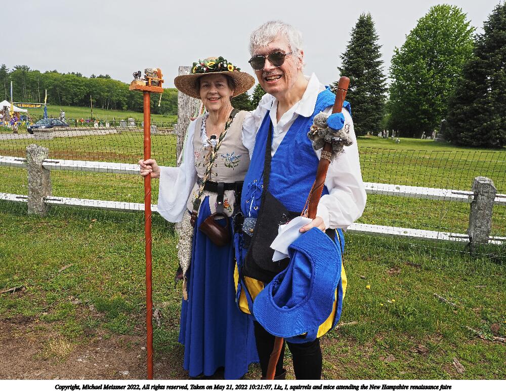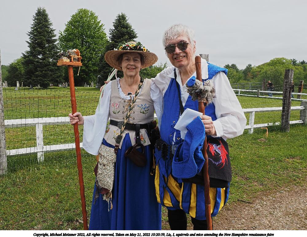 Picture #2: Liz, I, squirrels and mice attending the New Hampshire renaissance faire #2 Small: 1000x772, 265,949 bytes (260K), (html file) Large: 5000x3750, 6,449,862 bytes (6.2M), (html file) Copyright, Michael Meissner 2022, All rights reserved Olympus E-M5-III camera with Olympus-m43 12-40mm f/2.8 lens f/7.1, ISO 200, 1/400 sec, 12.0mm, auto mode, vivid color, center weight metering, IS Auto 35mm equivalent focal length 24.0mm Programs used: crop, raw therapee Taken by Michael Meissner on May 21, 2022 10:21:07 Last modified on May 23, 2022 at 21:50 |