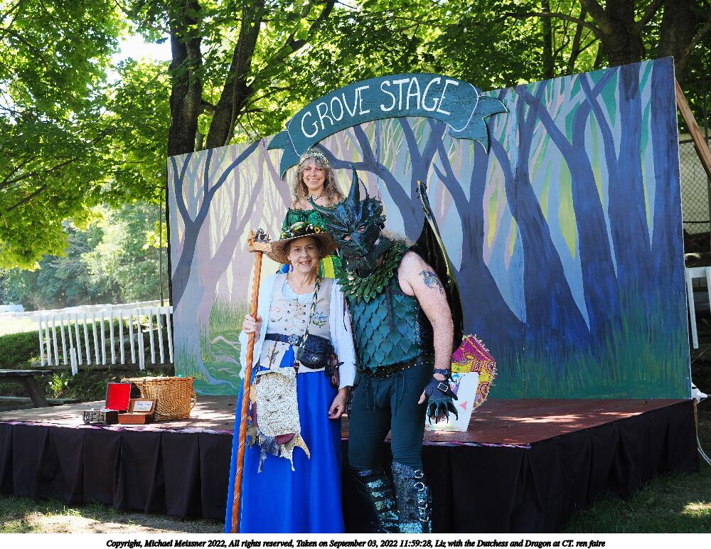 Picture #5: Liz with the Dutchess and Dragon at CT. ren faire Small: 1000x772, 241,447 bytes (236K), (html file) Large: 5000x3750, 5,422,430 bytes (5.2M), (html file) Copyright, Michael Meissner 2022, All rights reserved OM OM1 camera with Olympus-m43 12-40mm f/2.8 lens f/4.0, ISO 200, 1/125 sec, 23.0mm, auto mode, vivid color, matrix metering, IS Auto, anti-shock 35mm equivalent focal length 46.0mm Programs used: crop, raw therapee Taken by Michael Meissner on September 03, 2022 11:59:27 Last modified on January 08, 2023 at 17:17 |