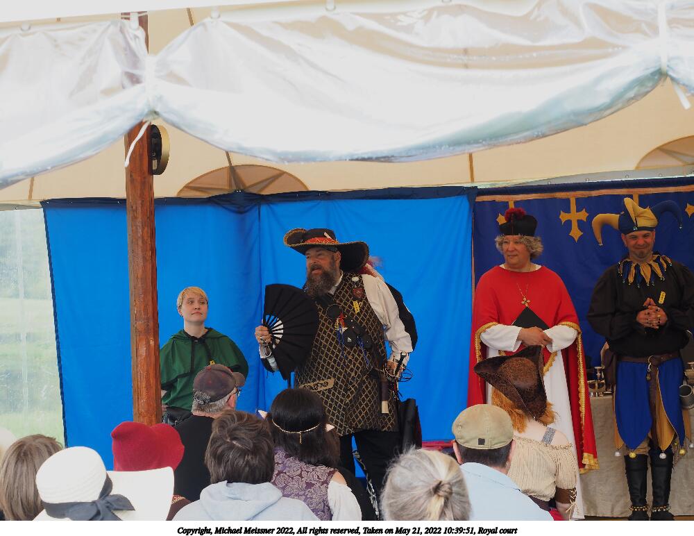 Picture #2: Royal court Small: 1000x772, 154,644 bytes (152K), (html file) Large: 5000x3750, 3,475,084 bytes (3.3M), (html file) Copyright, Michael Meissner 2022, All rights reserved Olympus E-M5-III camera with Olympus-m43 12-40mm f/2.8 lens f/5.6, ISO 200, 1/250 sec, 19.0mm, auto mode, vivid color, center weight metering, IS Auto 35mm equivalent focal length 38.0mm Programs used: crop, raw therapee Taken by Michael Meissner on May 21, 2022 10:39:12 Last modified on December 04, 2022 at 23:32 |