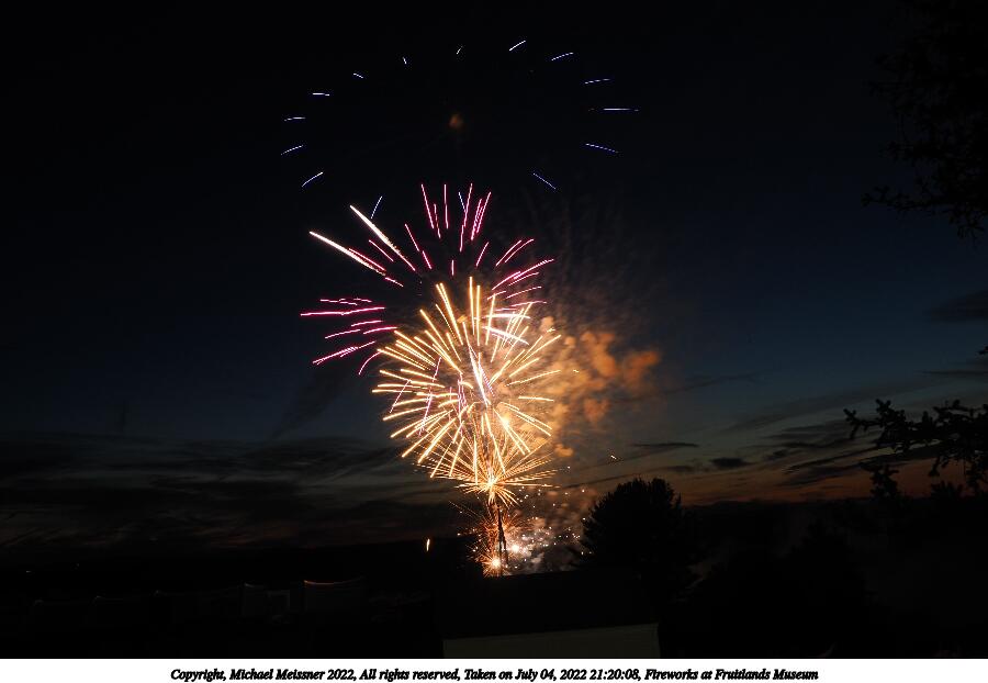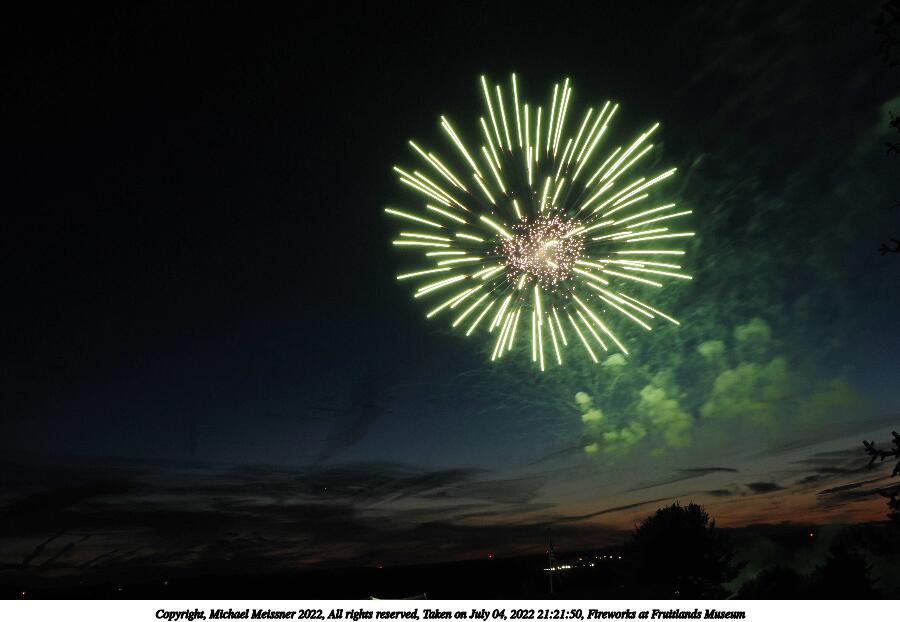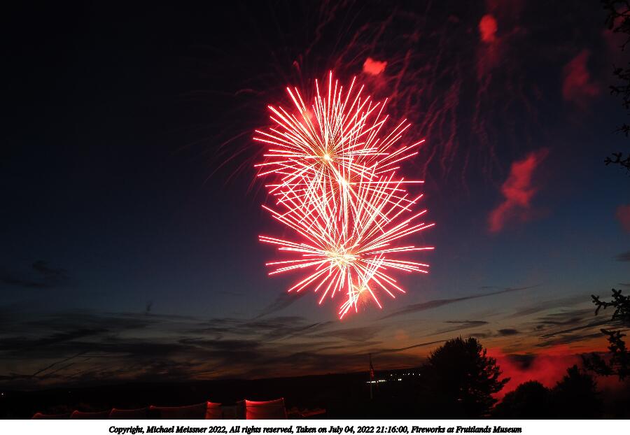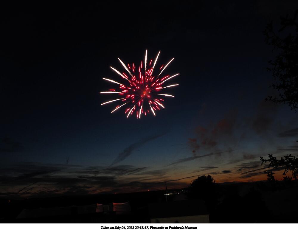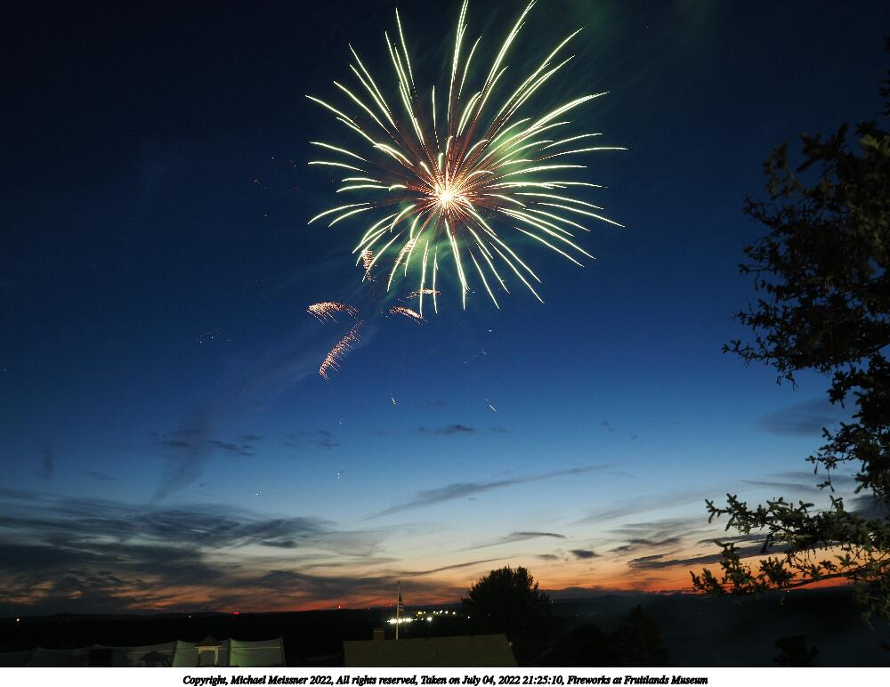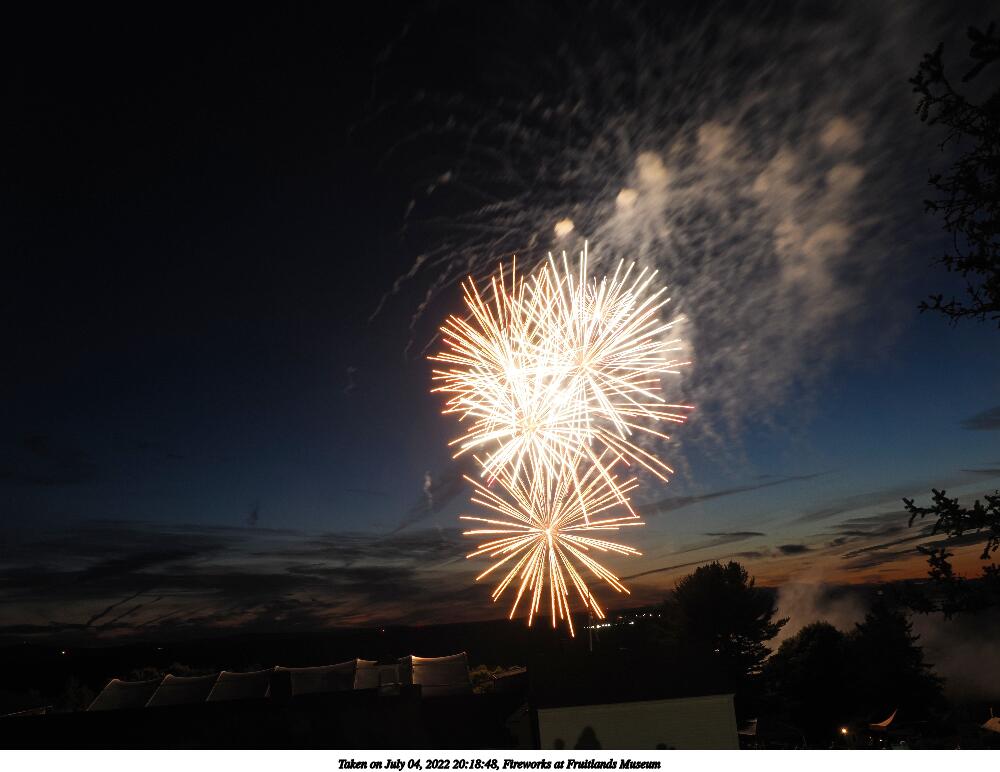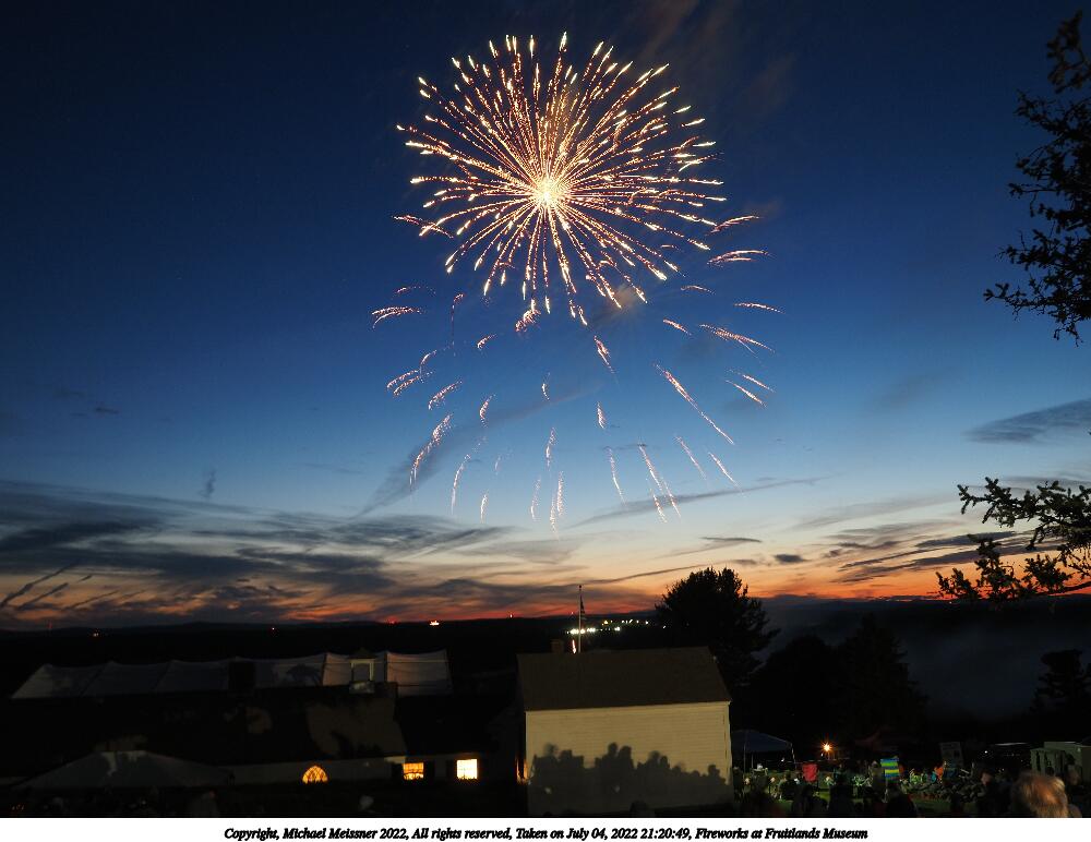 Picture #44: Fireworks at Fruitlands Museum #13 900x622, 93,966 bytes (92K), (html file) Copyright, Michael Meissner 2022, All rights reserved OM OM1 camera with Olympus-m43 12-40mm f/2.8 lens f/5.6, ISO 200, 1/3 sec, 12.0mm, manual mode, vivid color, matrix metering, manual focus, IS Auto, noise reduction auto, live time/bulb 35mm equivalent focal length 24.0mm Programs used: adjusttime, crop, gimp Taken by Michael Meissner on July 04, 2022 21:20:57 Last modified on July 08, 2022 at 23:38 |