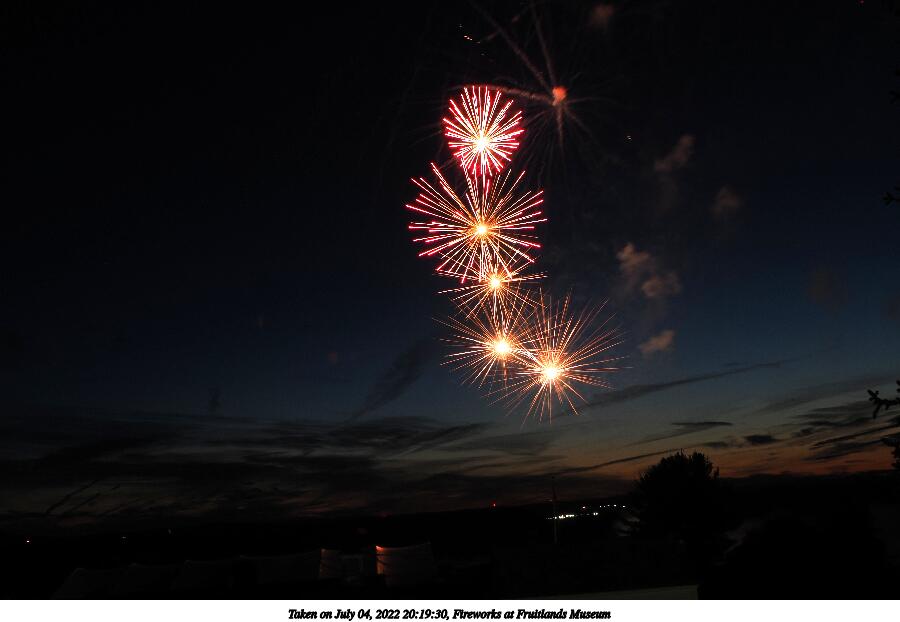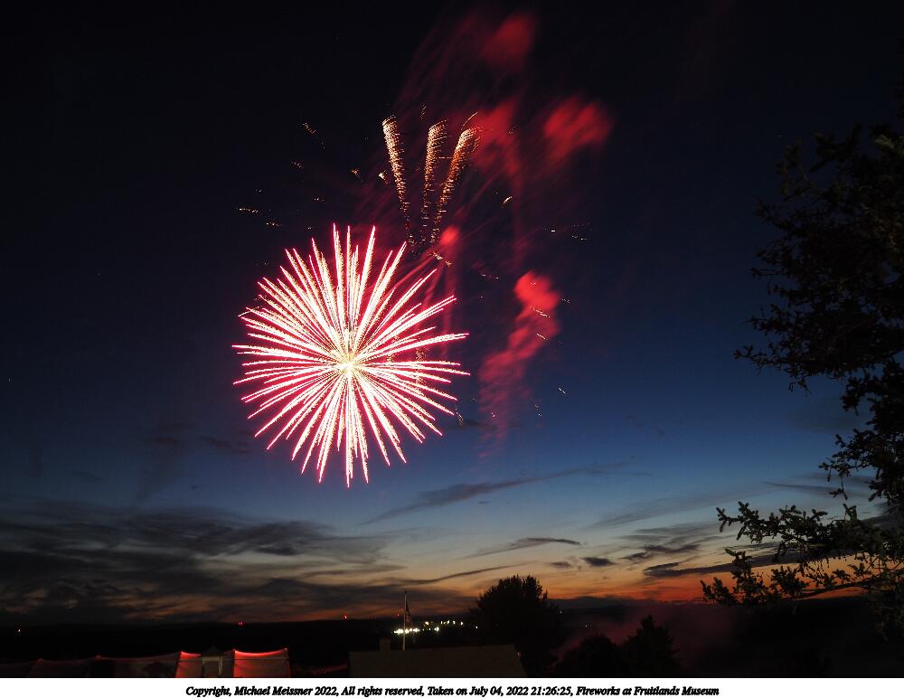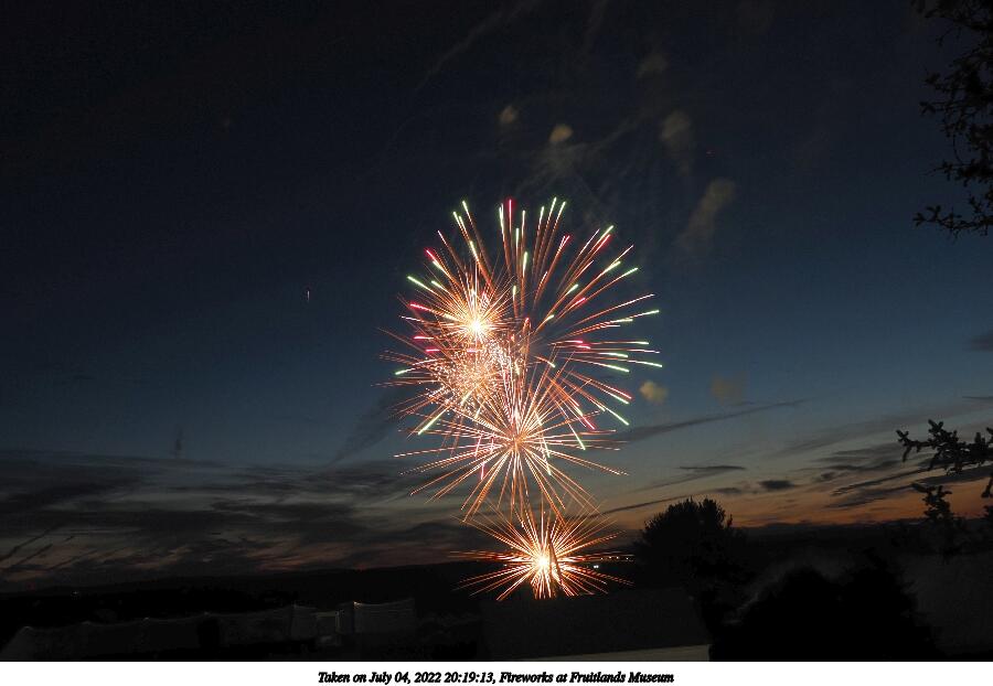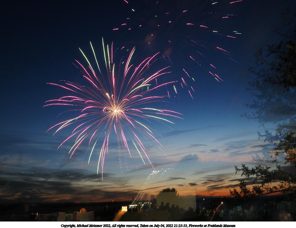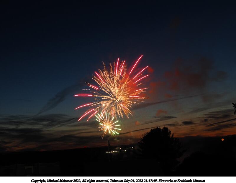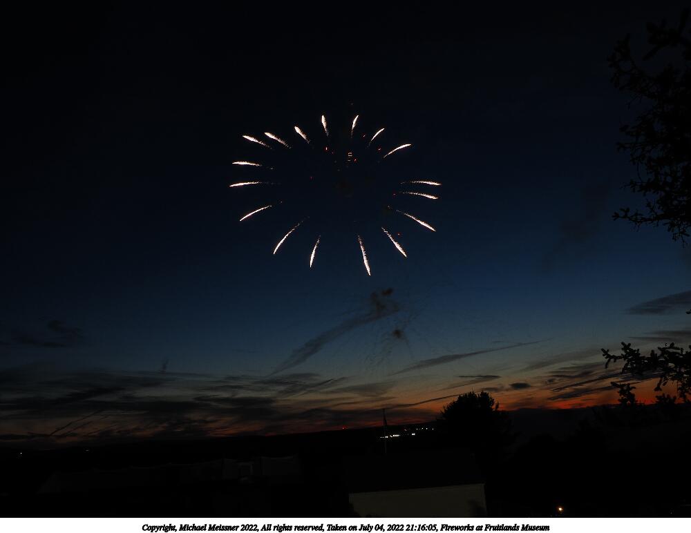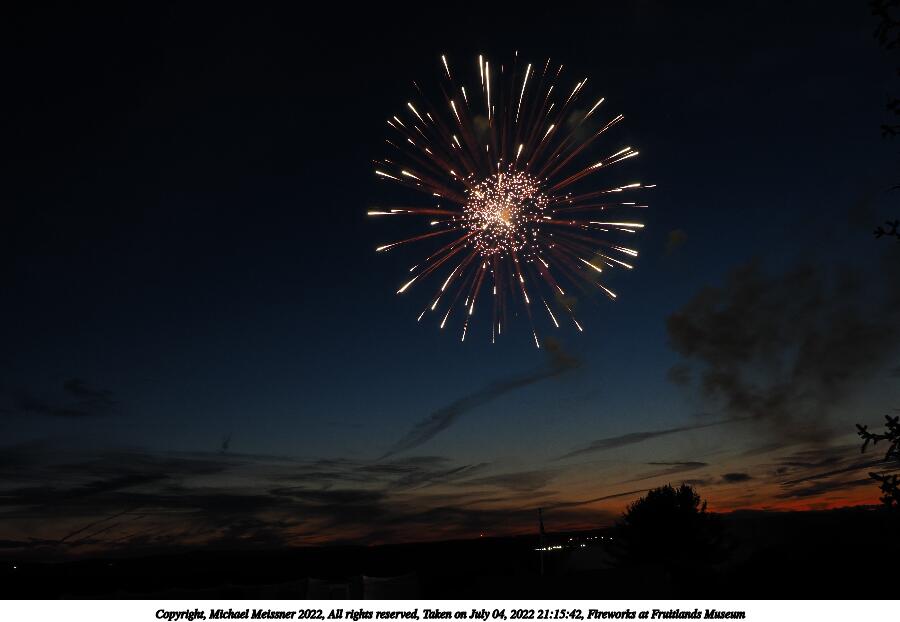Picture #44: Fireworks at Fruitlands Museum #13 900x622, 93,966 bytes (92K), (html file) Copyright, Michael Meissner 2022, All rights reserved OM OM1 camera with Olympus-m43 12-40mm f/2.8 lens f/5.6, ISO 200, 1/3 sec, 12.0mm, manual mode, vivid color, matrix metering, manual focus, IS Auto, noise reduction auto, live time/bulb 35mm equivalent focal length 24.0mm Programs used: adjusttime, crop, gimp Taken by Michael Meissner on July 04, 2022 21:20:57 Last modified on July 08, 2022 at 23:38 |