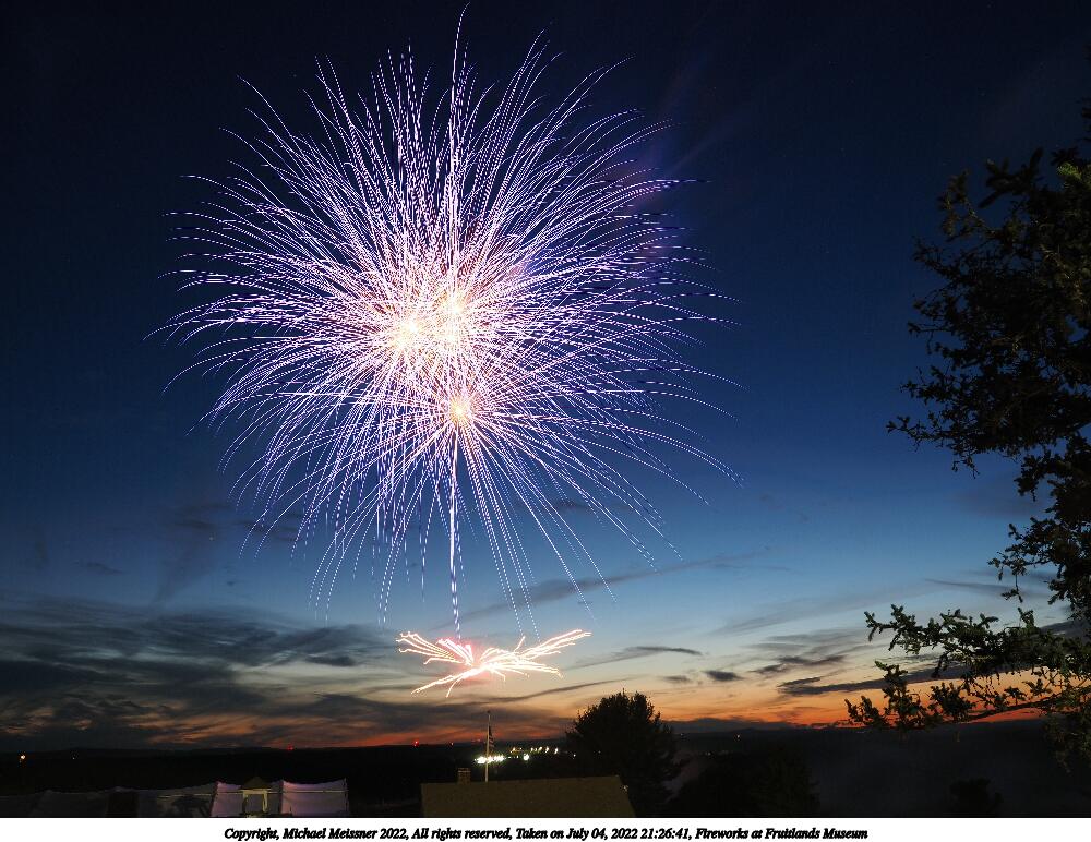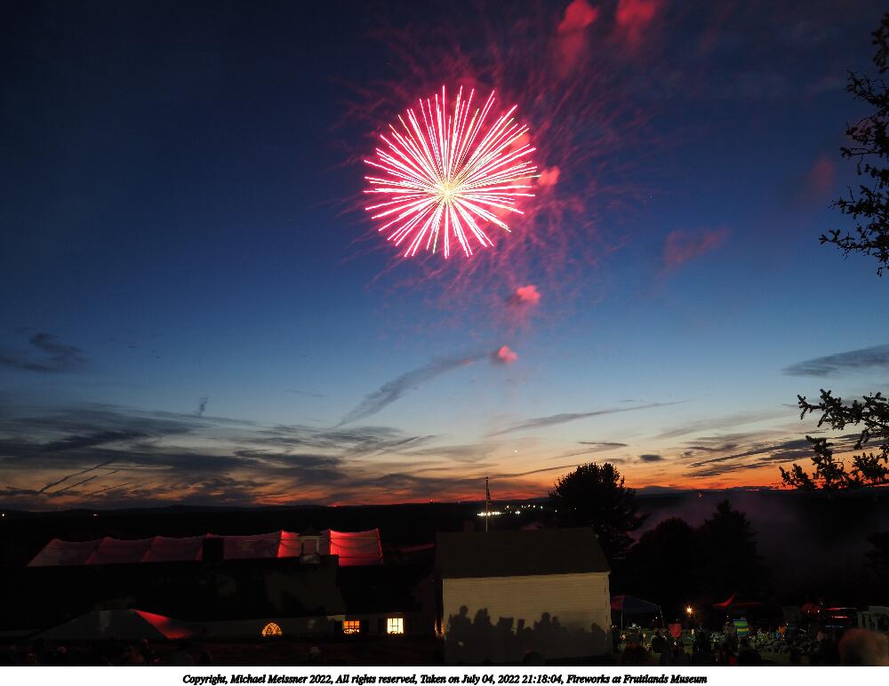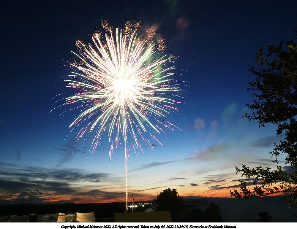 Picture #54: Fireworks at Fruitlands Museum #3 1000x772, 60,450 bytes (60K), (html file) Copyright, Michael Meissner 2022, All rights reserved OM OM1 camera with Olympus-m43 12-40mm f/2.8 lens f/5.6, ISO 200, 1/2 sec, 12.0mm, manual mode, vivid color, matrix metering, manual focus, IS Auto, noise reduction auto, live time/bulb 35mm equivalent focal length 24.0mm Programs used: adjusttime, crop, gimp Taken by Michael Meissner on July 04, 2022 21:16:05 Last modified on July 08, 2022 at 20:59 |