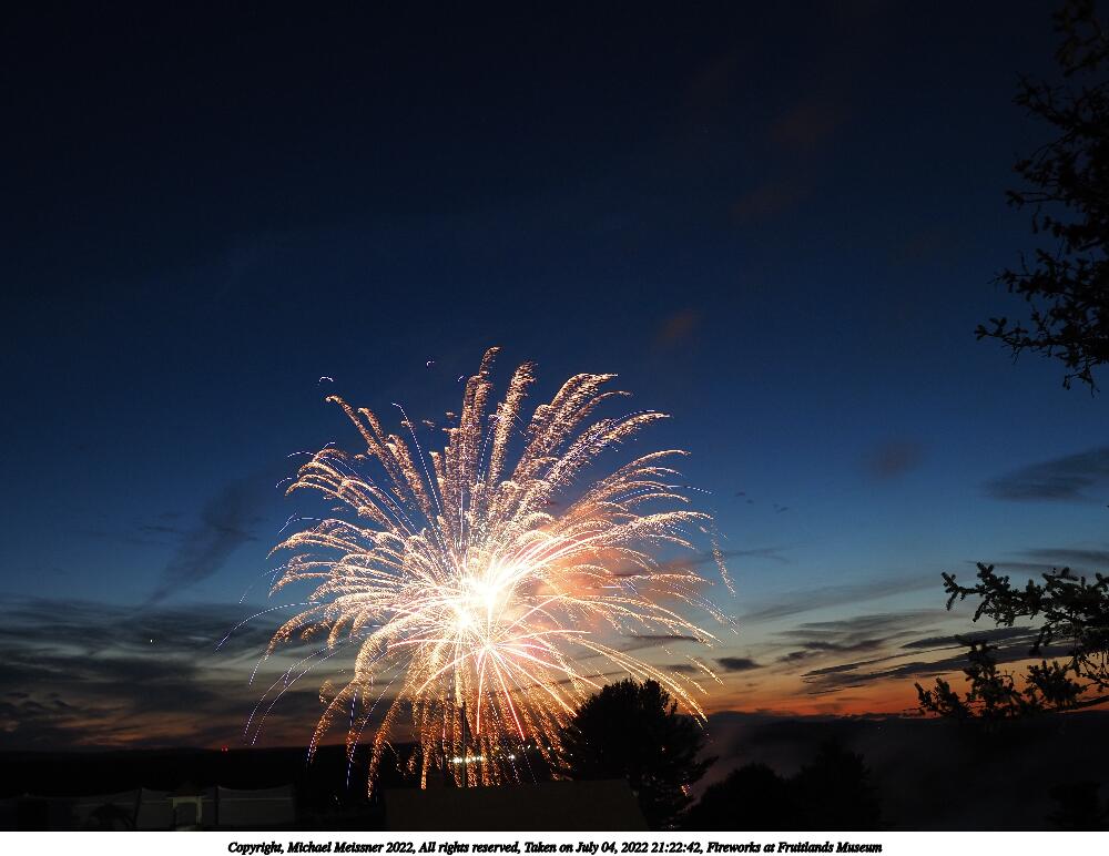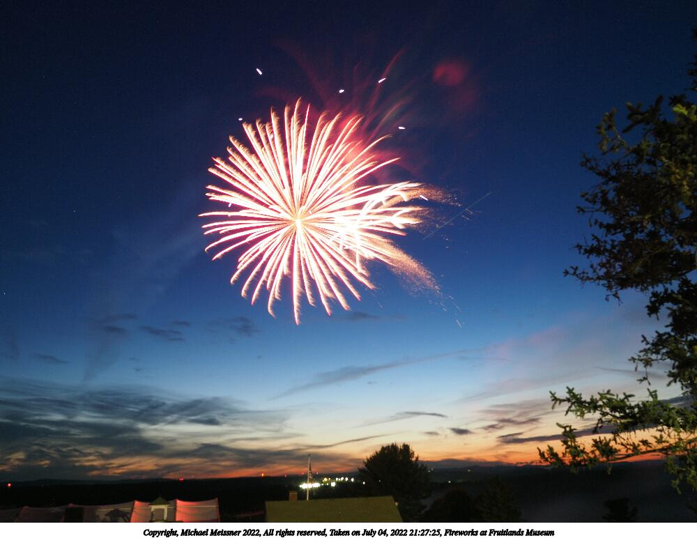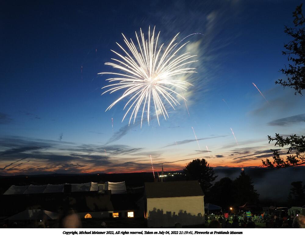 Picture #38: Fireworks at Fruitlands Museum #19 1000x772, 113,818 bytes (112K), (html file) Copyright, Michael Meissner 2022, All rights reserved Olympus E-M5-III camera with Panasonic-Leica 15mm f/1.7 lens f/5.6, ISO 200, 49 sec, 15.0mm, manual mode, vivid color, matrix metering, auto + manual focus, noise reduction auto, live time/bulb, face detection 35mm equivalent focal length 30.0mm Programs used: crop Taken by Michael Meissner on July 04, 2022 21:23:33 Last modified on July 08, 2022 at 23:46 This picture is one of my favorites. |