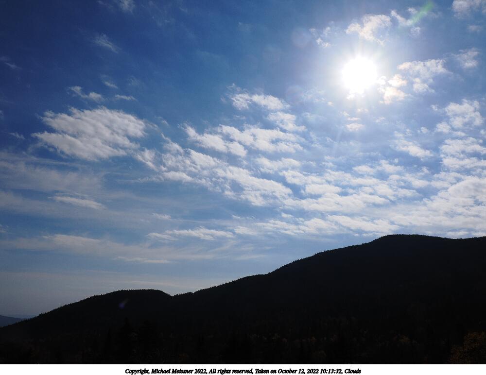 Picture #108: Clouds #4 1000x772, 58,437 bytes (58K), (html file) Copyright, Michael Meissner 2022, All rights reserved OM OM1 camera with Olympus-m43 12-200mm f/3.5-6.3 lens f/11.0, ISO 200, 1/1600 sec, 149.0mm, auto mode, vivid color, matrix metering, IS Auto, face detection 35mm equivalent focal length 299.0mm Programs used: crop, gimp, raw therapee Taken by Michael Meissner on October 12, 2022 10:34:18 Last modified on November 07, 2022 at 17:32 |