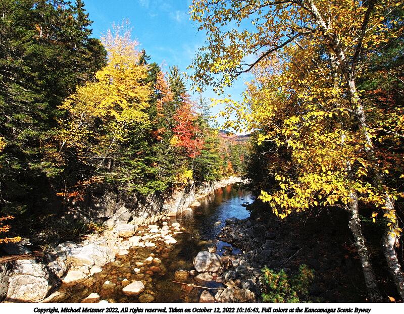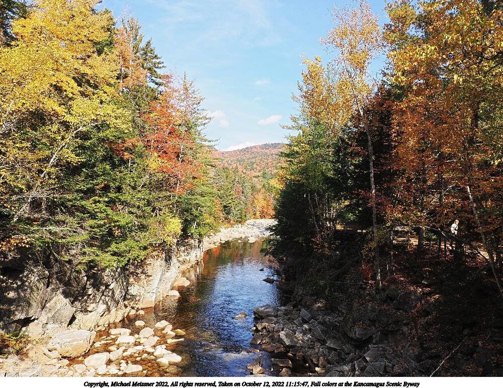 Picture #99: Fall colors at the Kancamagus Scenic Byway #22 1000x772, 332,292 bytes (325K), (html file) Copyright, Michael Meissner 2022, All rights reserved OM OM1 camera with Olympus-m43 12-200mm f/3.5-6.3 lens f/7.1, ISO 200, 1/200 sec, 14.0mm, auto mode, vivid color, matrix metering, IS Auto, anti-shock 35mm equivalent focal length 28.0mm Programs used: crop, gimp, raw therapee Taken by Michael Meissner on October 12, 2022 11:15:47 Last modified on November 07, 2022 at 17:40 |