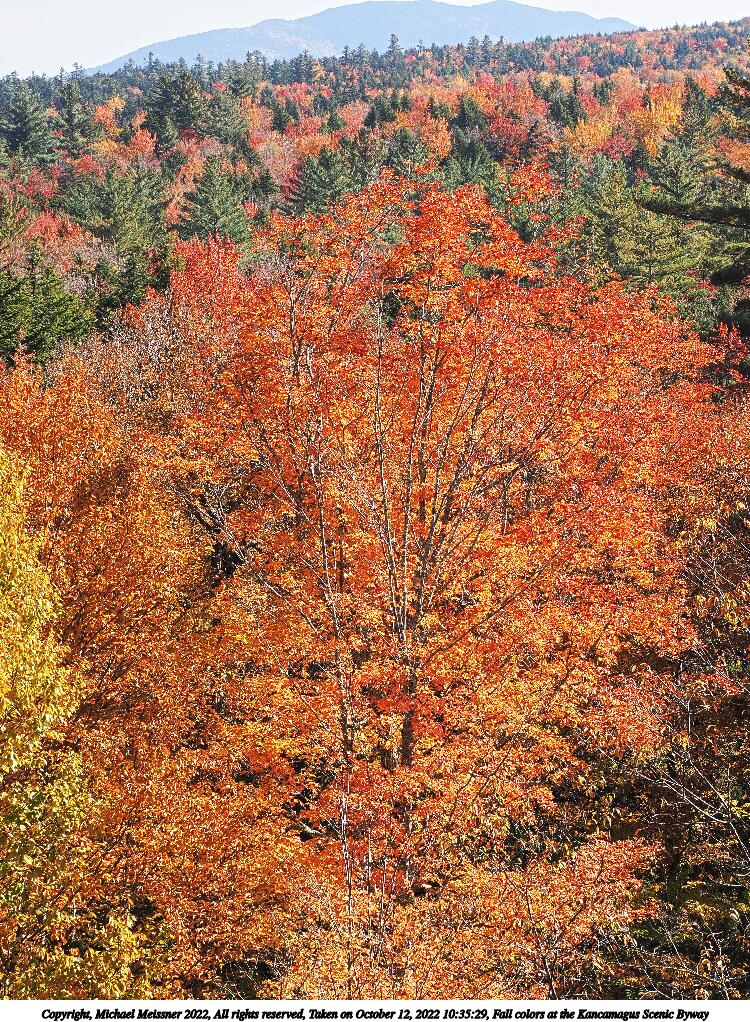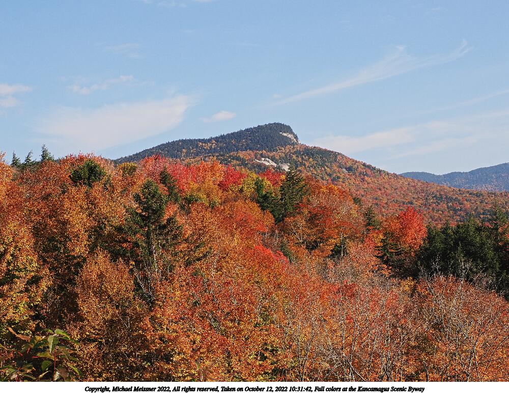 Picture #80: Fall colors at the Kancamagus Scenic Byway #26 1000x772, 265,478 bytes (260K), (html file) Copyright, Michael Meissner 2022, All rights reserved OM OM1 camera with Olympus-m43 12-200mm f/3.5-6.3 lens f/10.0, ISO 200, 1/250 sec, 42.0mm, auto mode, vivid color, matrix metering, IS Auto, anti-shock 35mm equivalent focal length 84.0mm Programs used: crop, raw therapee Taken by Michael Meissner on October 12, 2022 12:15:10 Last modified on November 07, 2022 at 17:52 |