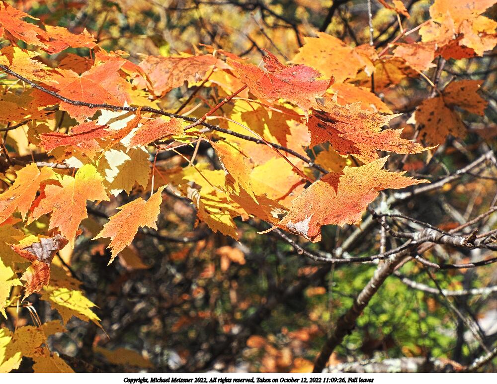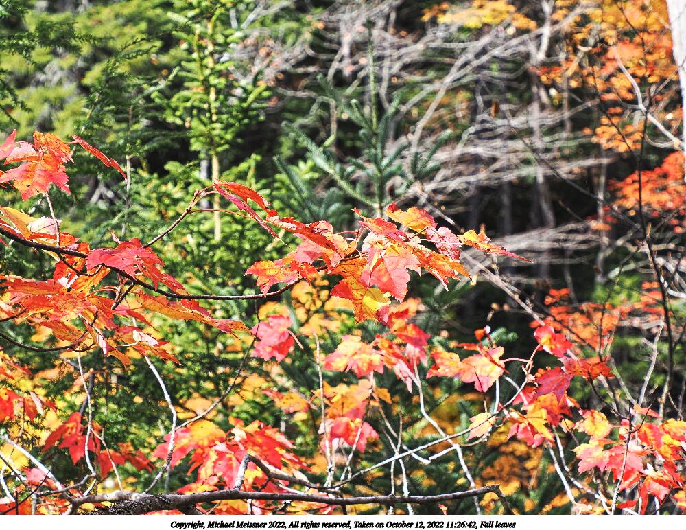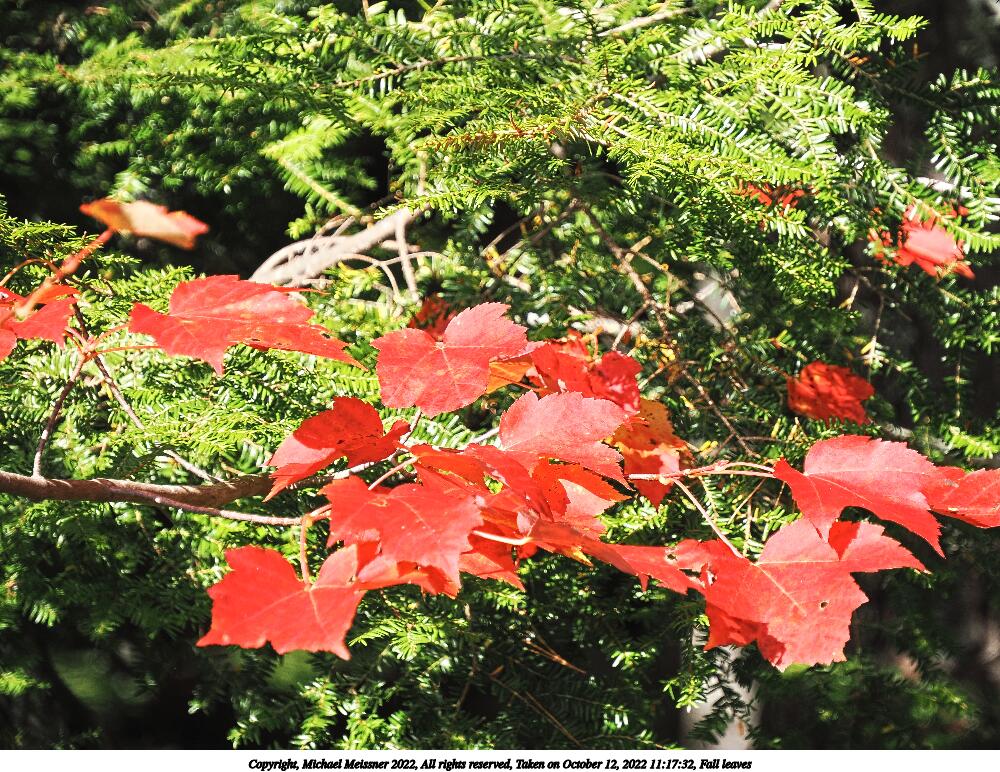 Picture #95: Fall leaves #3 1000x772, 260,858 bytes (255K), (html file) Copyright, Michael Meissner 2022, All rights reserved OM OM1 camera with Olympus-m43 12-200mm f/3.5-6.3 lens f/6.3, ISO 250, 1/320 sec, 162.0mm, auto mode, vivid color, matrix metering, IS Auto 35mm equivalent focal length 325.0mm Programs used: crop, raw therapee Taken by Michael Meissner on October 12, 2022 11:17:32 Last modified on November 07, 2022 at 17:44 |