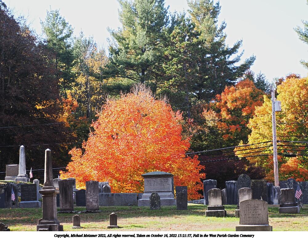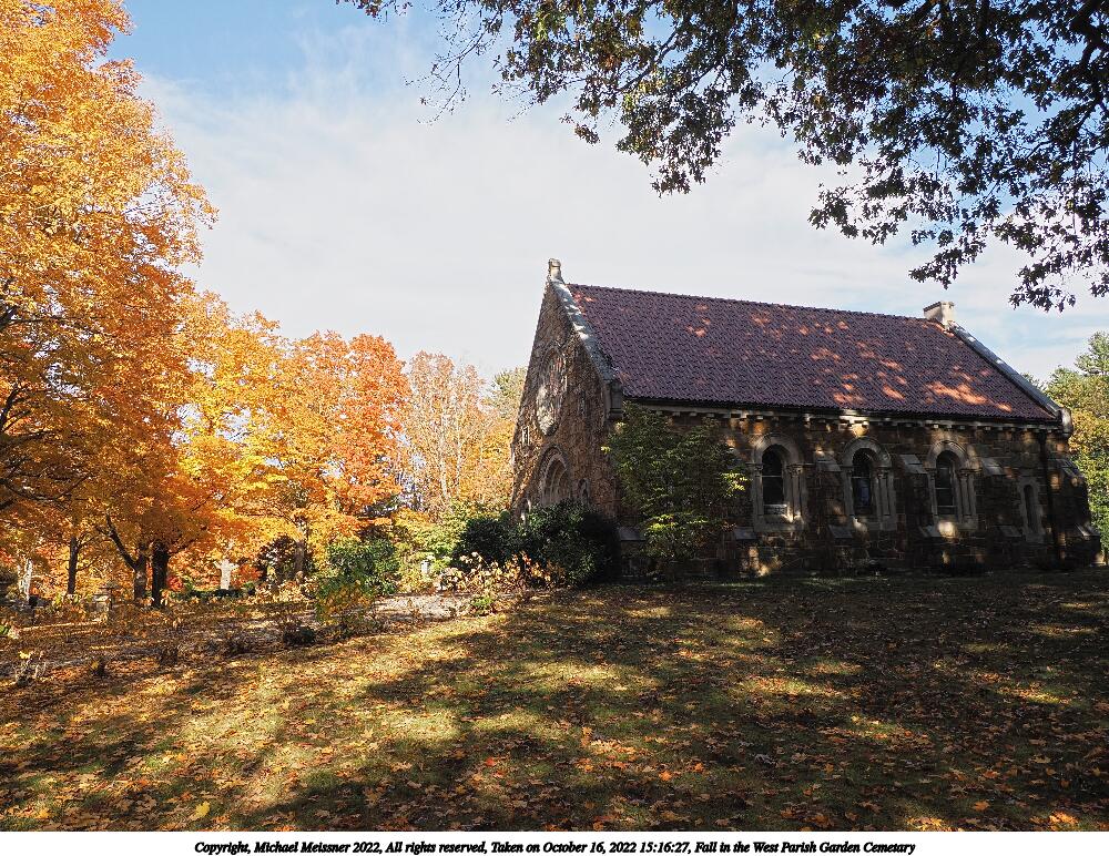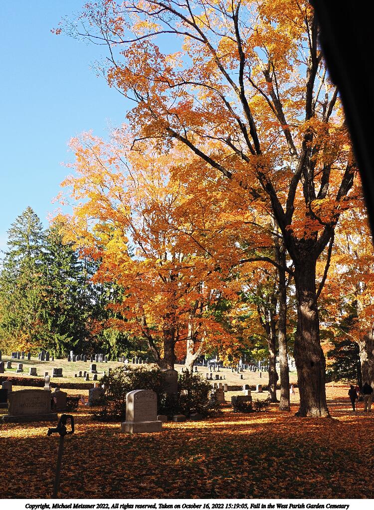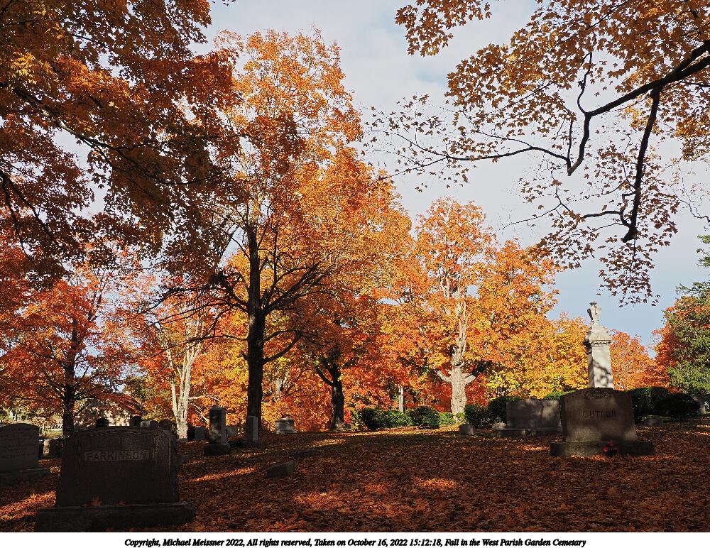 Picture #67: Fall in the West Parish Garden Cemetary #3 1000x772, 260,233 bytes (255K), (html file) Copyright, Michael Meissner 2022, All rights reserved OM OM1 camera with Olympus-m43 12-200mm f/3.5-6.3 lens f/6.3, ISO 200, 1/160 sec, 15.0mm, auto mode, vivid color, matrix metering, IS Auto, anti-shock 35mm equivalent focal length 30.0mm Programs used: crop, raw therapee Taken by Michael Meissner on October 16, 2022 15:13:40 Last modified on November 24, 2022 at 21:37 |