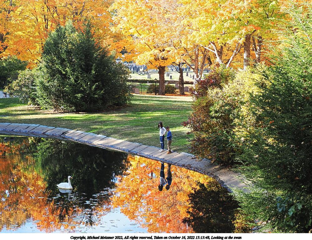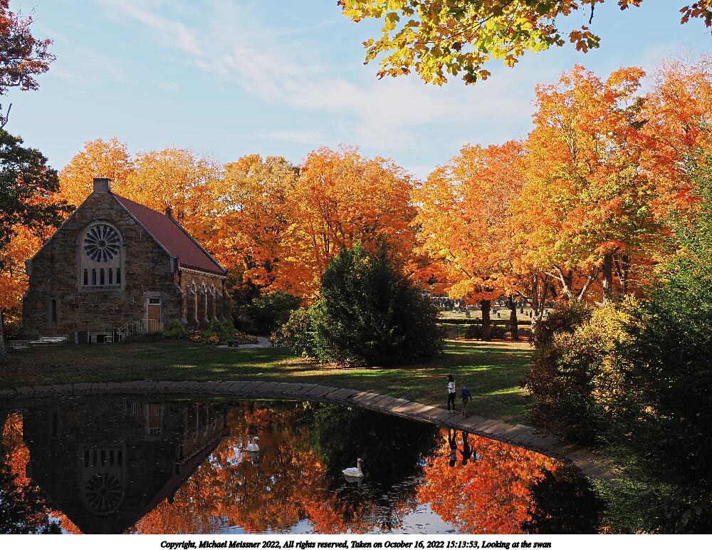 Picture #65: Looking at the swan #2 1000x772, 264,894 bytes (259K), (html file) Copyright, Michael Meissner 2022, All rights reserved OM OM1 camera with Olympus-m43 12-200mm f/3.5-6.3 lens f/7.1, ISO 200, 1/200 sec, 20.0mm, auto mode, vivid color, matrix metering, IS Auto, anti-shock 35mm equivalent focal length 40.0mm Programs used: crop, raw therapee Taken by Michael Meissner on October 16, 2022 15:13:53 Last modified on November 24, 2022 at 21:39 This picture is one of my favorites. |