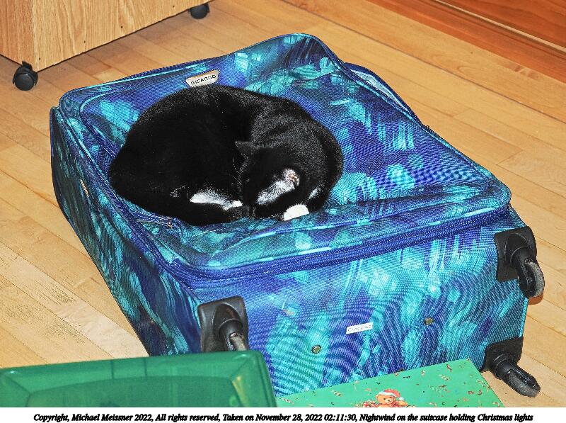Picture #4: Nightwind on the suitcase holding Christmas lights #2 800x597, 156,988 bytes (154K), (html file) Copyright, Michael Meissner 2022, All rights reserved OM OM1 camera with Olympus-m43 12-40mm f/2.8 lens f/2.8, ISO 200, flash, 1/60 sec, 34.0mm, auto mode, vivid color, matrix metering, IS Auto, anti-shock 35mm equivalent focal length 68.0mm Programs used: crop, gimp, raw therapee Taken by Michael Meissner on November 28, 2022 02:11:30 Last modified on December 21, 2022 at 22:07 |