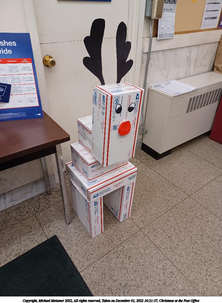 Picture #1: Christmas at the Post Office 750x1022, 159,700 bytes (156K), (html file) Copyright, Michael Meissner 2022, All rights reserved Samsung A32 5G phone f/1.8, ISO 320, 1/60 sec, 4.6mm, auto mode, center weight metering 35mm equivalent focal length 25.0mm Programs used: crop, rotate right Taken by Michael Meissner on December 01, 2022 16:21:37 Last modified on December 04, 2022 at 01:42 |