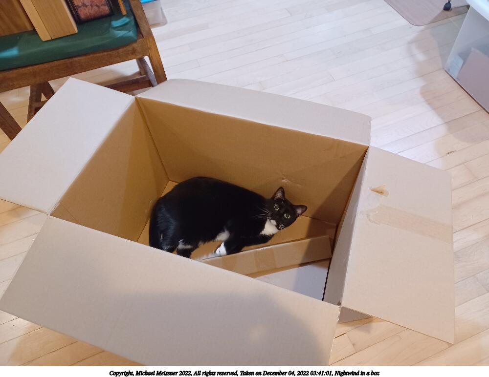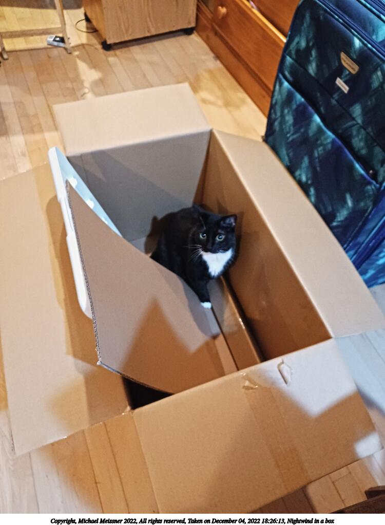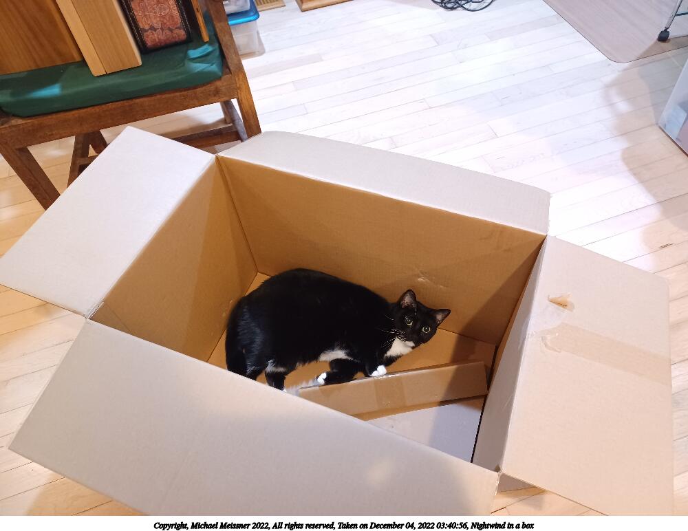 Picture #5: Nightwind in a box #3 750x1022, 78,069 bytes (77K), (html file) Copyright, Michael Meissner 2022, All rights reserved Samsung A32 5G phone f/1.8, ISO 1250, 1/17 sec, 4.6mm, auto mode, spot metering 35mm equivalent focal length 25.0mm Programs used: raw therapee, rotate right Taken by Michael Meissner on December 04, 2022 18:26:13 Last modified on December 21, 2022 at 22:08 |