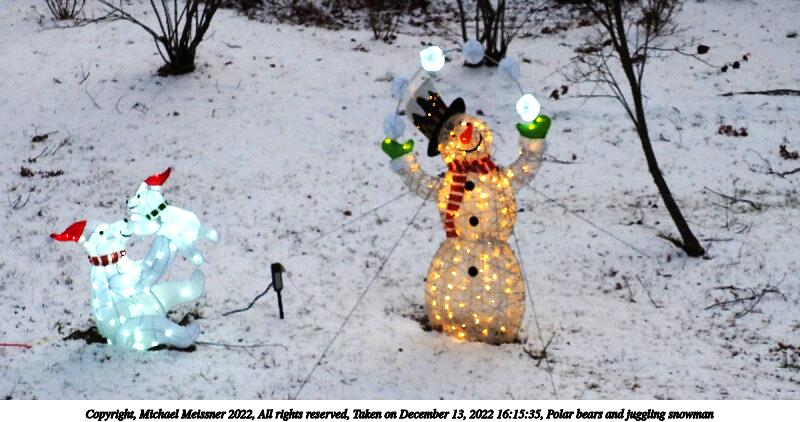 Picture #3: Polar bears and juggling snowman #2 800x422, 89,199 bytes (88K), (html file) Copyright, Michael Meissner 2022, All rights reserved Olympus E-M5-III camera with Olympus-m43 12-200mm f/3.5-6.3 lens f/5.0, ISO 640, 1/60 sec, 25.0mm, auto mode, vivid color, matrix metering, IS Auto, noise reduction auto, face detection 35mm equivalent focal length 50.0mm Programs used: crop, gimp, raw therapee Taken by Michael Meissner on December 13, 2022 16:15:35 Last modified on December 21, 2022 at 22:13 |