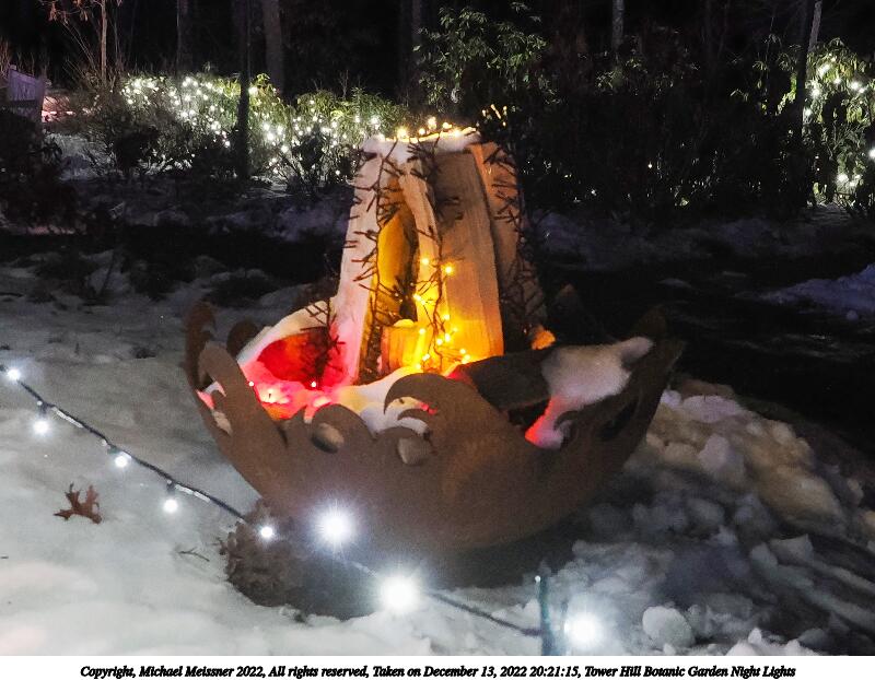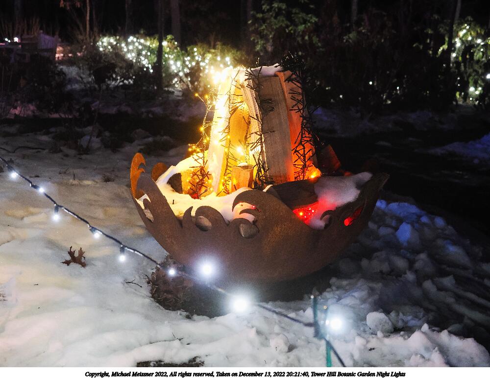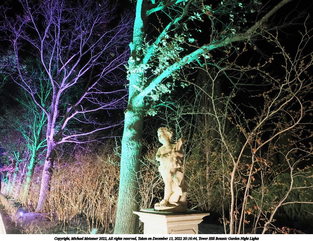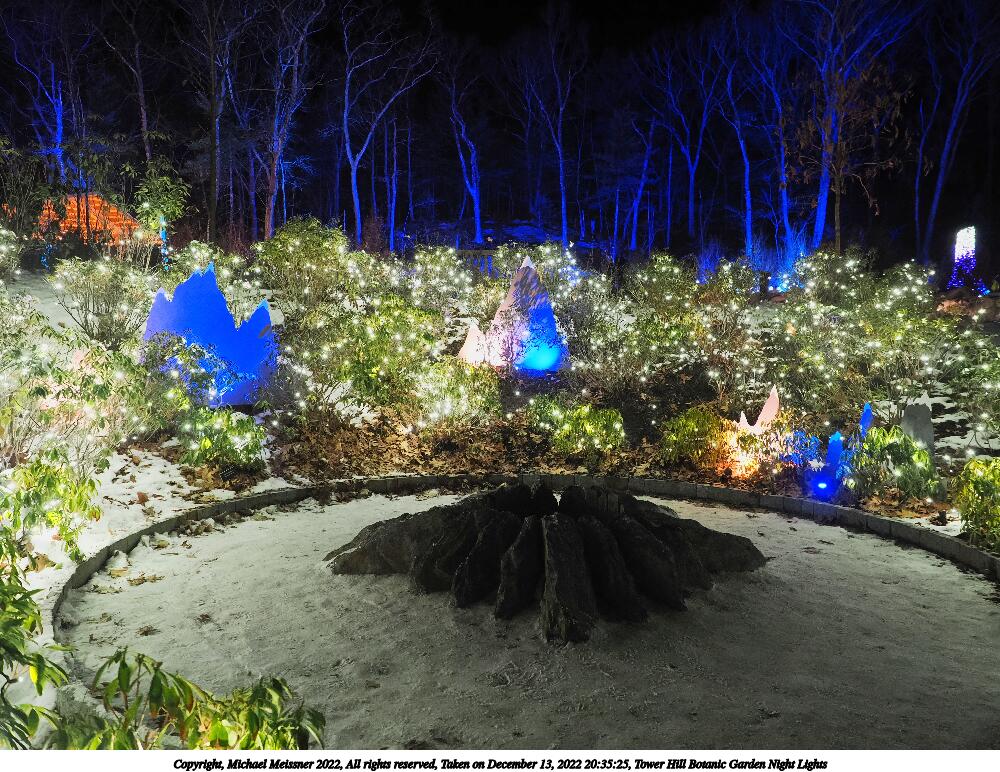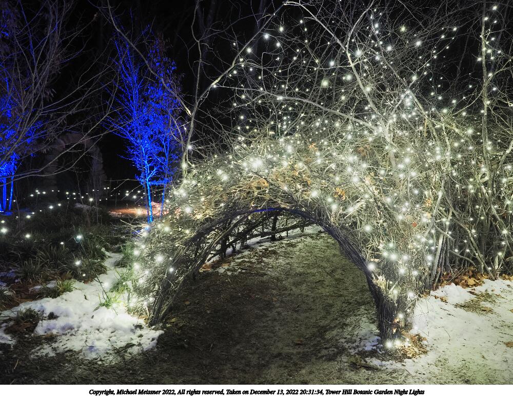 Picture #4: Tower Hill Botanic Garden Night Lights 1000x772, 185,846 bytes (182K), (html file) Copyright, Michael Meissner 2022, All rights reserved OM OM1 camera with Olympus-m43 12-40mm f/2.8 lens f/2.8, ISO 6400, 1/60 sec, 18.0mm, auto mode, vivid color, matrix metering, IS Auto, anti-shock 35mm equivalent focal length 36.0mm Programs used: crop, raw therapee Taken by Michael Meissner on December 13, 2022 20:08:01 Last modified on December 21, 2022 at 22:14 |