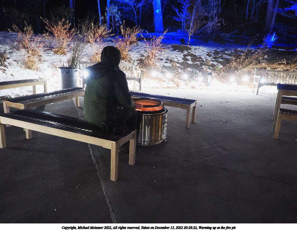 Picture #20: Warming up at the fire pit 1000x772, 173,973 bytes (170K), (html file) Copyright, Michael Meissner 2022, All rights reserved OM OM1 camera with Olympus-m43 12-40mm f/2.8 lens f/2.8, ISO 4000, 1/60 sec, 13.0mm, auto mode, vivid color, matrix metering, IS Auto, anti-shock 35mm equivalent focal length 26.0mm Programs used: crop, raw therapee Taken by Michael Meissner on December 13, 2022 20:28:22 Last modified on December 21, 2022 at 22:27 |