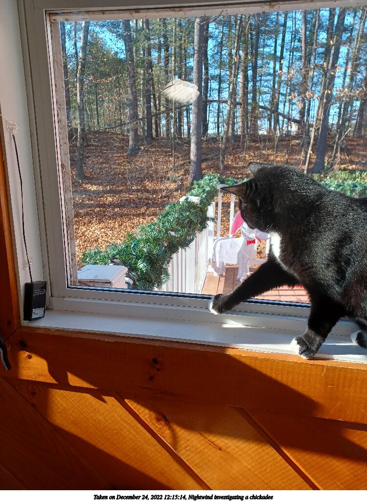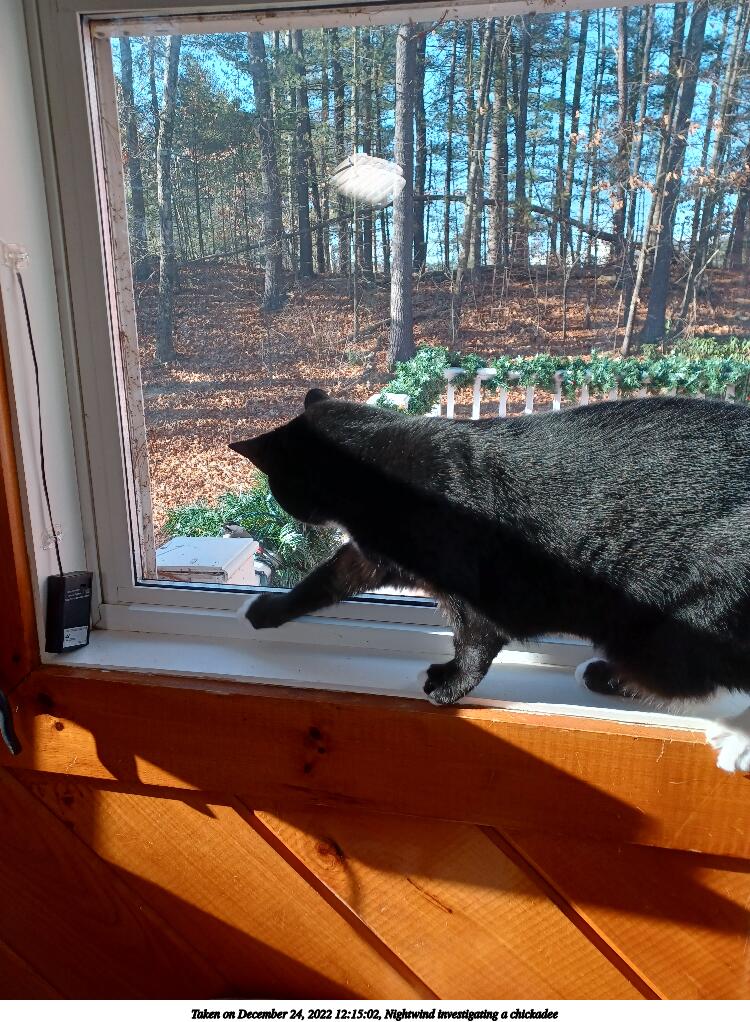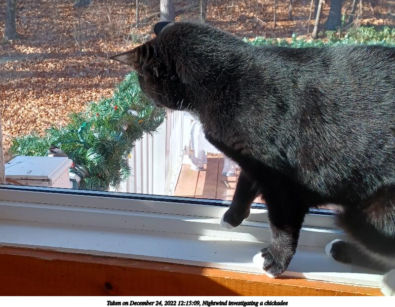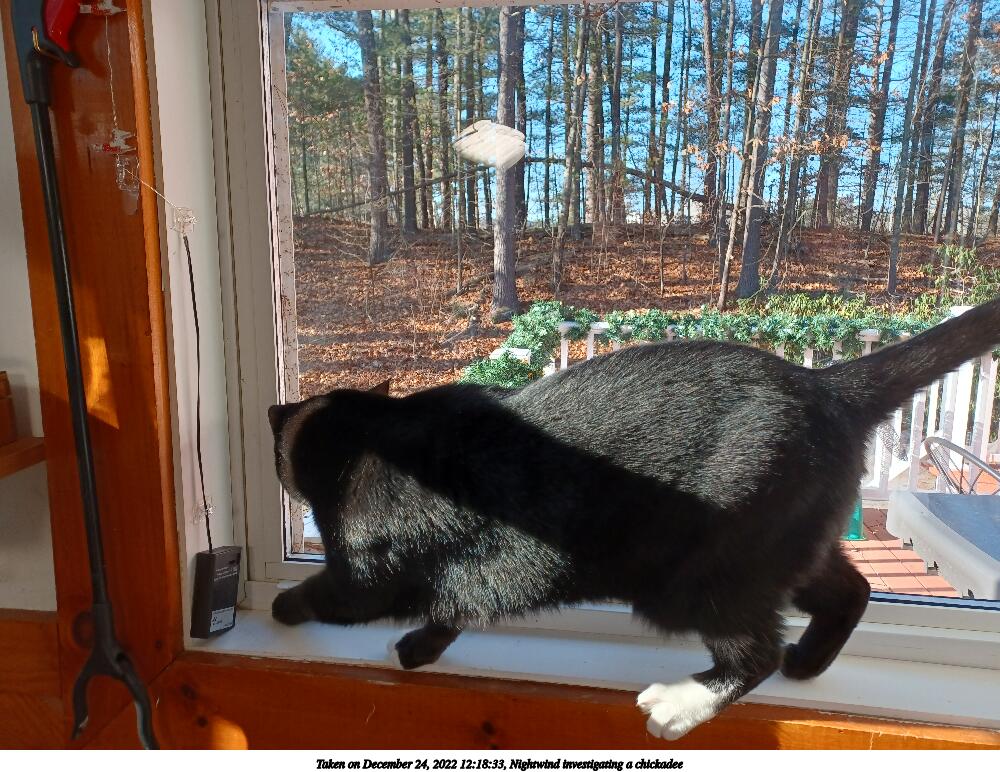 Picture #9: Nightwind investigating a chickadee #3 800x622, 132,099 bytes (130K), (html file) Samsung A32 5G phone f/1.8, ISO 40, 1/60 sec, 4.6mm, auto mode, center weight metering 35mm equivalent focal length 25.0mm Programs used: gimp, rotate right Taken by Michael Meissner on December 24, 2022 12:15:09 Last modified on December 25, 2022 at 11:14 |