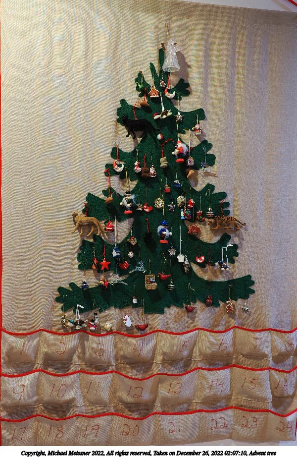 Picture #31: Advent tree 600x922, 158,299 bytes (155K), (html file) Copyright, Michael Meissner 2022, All rights reserved OM OM1 camera with Olympus-m43 12-40mm f/2.8 lens f/5.6, ISO 200, 1/3 sec, 12.0mm, aperture priority, vivid color, matrix metering, IS Auto, anti-shock 35mm equivalent focal length 24.0mm Programs used: crop, gimp, raw therapee Taken by Michael Meissner on December 26, 2022 02:07:10 Last modified on December 28, 2022 at 01:28 |