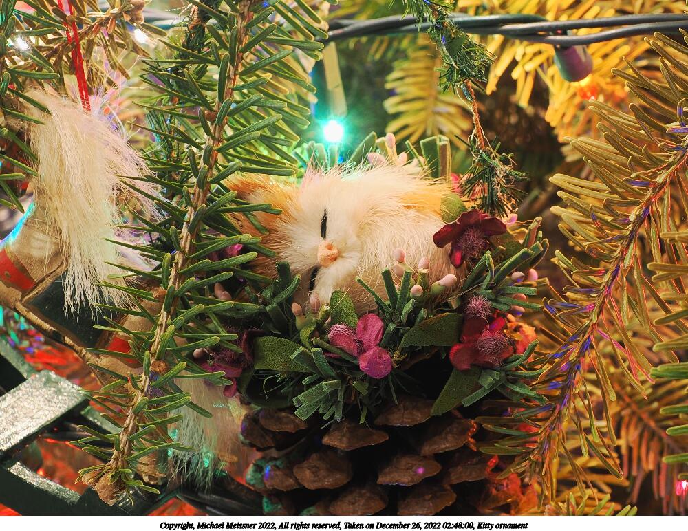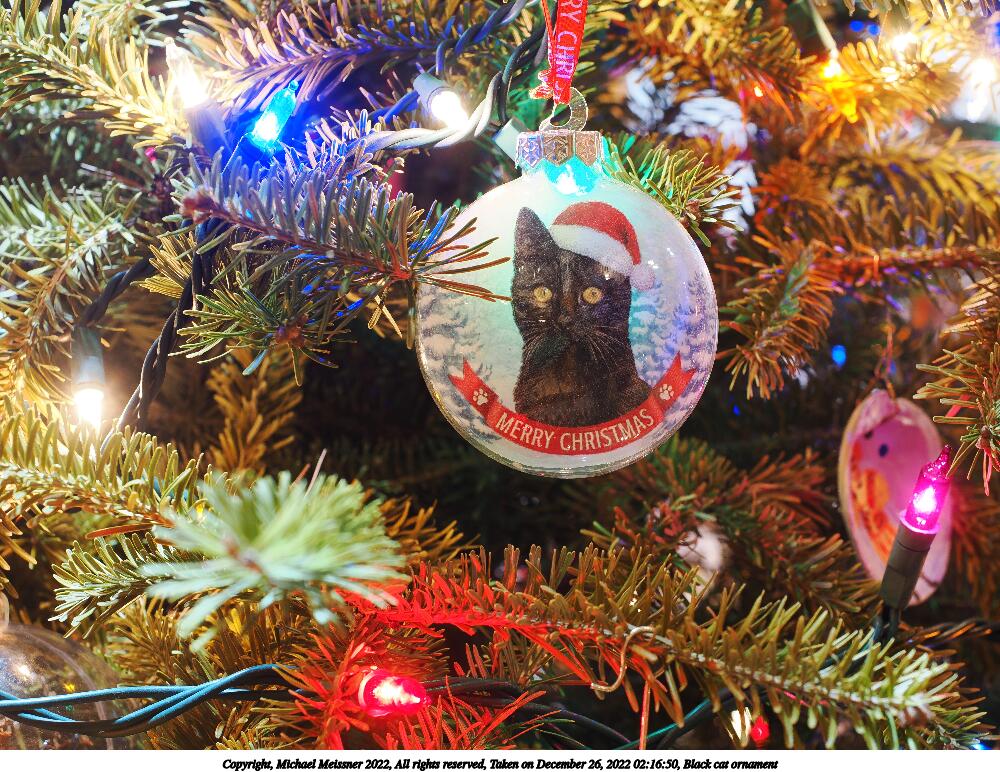 Picture #46: Kitty ornament 1000x772, 222,364 bytes (218K), (html file) Copyright, Michael Meissner 2022, All rights reserved OM OM1 camera with Olympus-m43 12-40mm f/2.8 lens f/5.6, ISO 200, 1.6 sec, 26.0mm, aperture priority, vivid color, matrix metering, digital zoom x2, IS Auto, anti-shock 35mm equivalent focal length 104.0mm, digital zoom x2 Programs used: crop, raw therapee Taken by Michael Meissner on December 26, 2022 02:48:00 Last modified on December 28, 2022 at 01:54 |