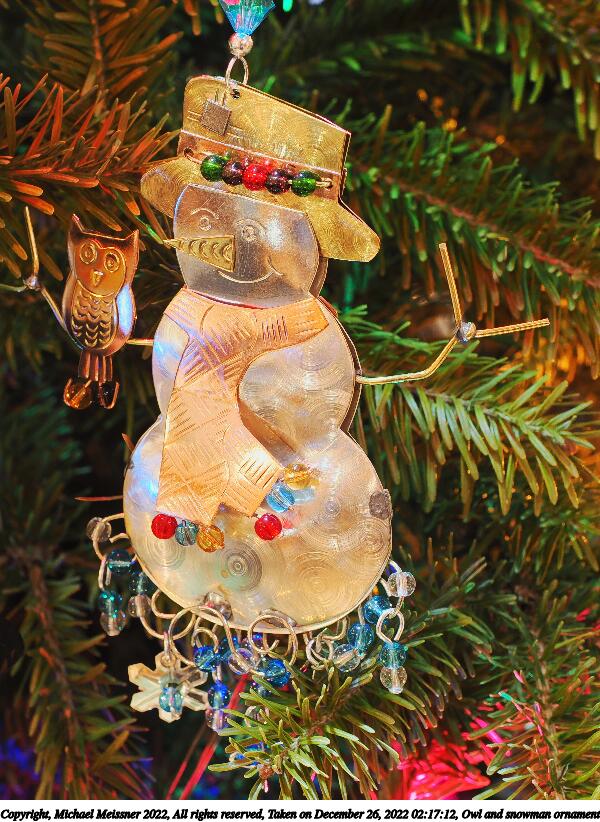 Picture #34: Owl and snowman ornament 600x822, 145,838 bytes (143K), (html file) Copyright, Michael Meissner 2022, All rights reserved OM OM1 camera with Olympus-m43 12-40mm f/2.8 lens f/5.6, ISO 200, 2 sec, 40.0mm, aperture priority, vivid color, matrix metering, IS Auto, anti-shock 35mm equivalent focal length 80.0mm Programs used: crop, gimp, raw therapee Taken by Michael Meissner on December 26, 2022 02:17:12 Last modified on December 28, 2022 at 01:32 |
