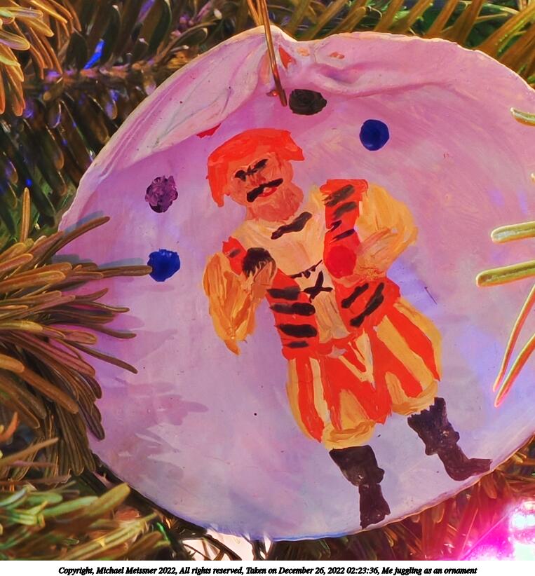 Picture #36: Me juggling as an ornament 763x822, 119,197 bytes (117K), (html file) Copyright, Michael Meissner 2022, All rights reserved OM OM1 camera with Olympus-m43 12-40mm f/2.8 lens f/5.6, ISO 200, 1.6 sec, 40.0mm, aperture priority, vivid color, matrix metering, digital zoom x2, IS Auto, focus stacked 35mm equivalent focal length 160.0mm, digital zoom x2 Programs used: crop, gimp, raw therapee Taken by Michael Meissner on December 26, 2022 02:23:36 Last modified on December 28, 2022 at 01:37 |
