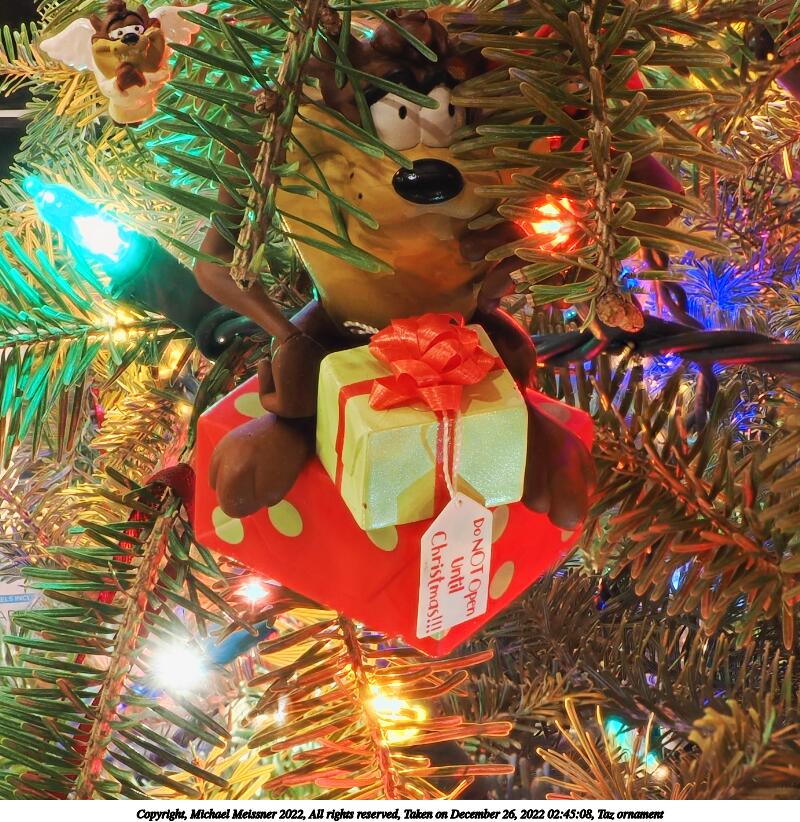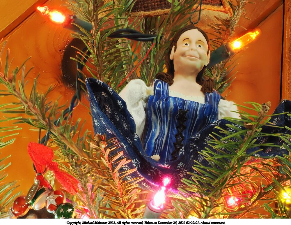 Picture #43: Donald selfie ornament 600x822, 90,356 bytes (89K), (html file) Copyright, Michael Meissner 2022, All rights reserved OM OM1 camera with Olympus-m43 12-40mm f/2.8 lens f/5.6, ISO 200, 2 sec, 40.0mm, aperture priority, vivid color, matrix metering, digital zoom x2, IS Auto, anti-shock 35mm equivalent focal length 160.0mm, digital zoom x2 Programs used: crop, gimp, raw therapee Taken by Michael Meissner on December 26, 2022 02:42:51 Last modified on December 28, 2022 at 01:49 |