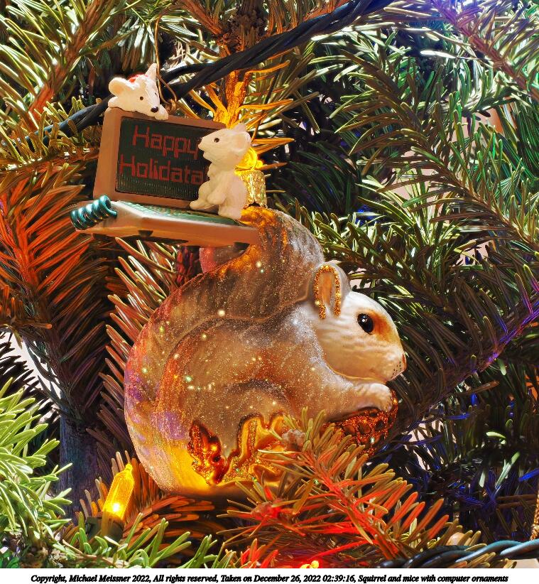 Picture #42: Squirrel and mice with computer ornaments 759x822, 219,716 bytes (215K), (html file) Copyright, Michael Meissner 2022, All rights reserved OM OM1 camera with Olympus-m43 12-40mm f/2.8 lens f/5.6, ISO 200, 0.8 sec, 40.0mm, aperture priority, vivid color, matrix metering, IS Auto, focus stacked 35mm equivalent focal length 80.0mm Programs used: crop, gimp, raw therapee Taken by Michael Meissner on December 26, 2022 02:39:16 Last modified on December 28, 2022 at 01:47 |