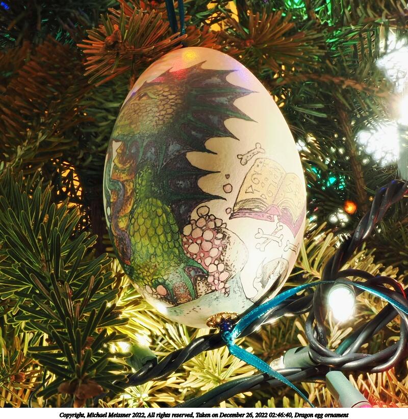 Picture #45: Dragon egg ornament 800x822, 180,286 bytes (177K), (html file) Copyright, Michael Meissner 2022, All rights reserved OM OM1 camera with Olympus-m43 12-40mm f/2.8 lens f/5.6, ISO 200, 0.8 sec, 22.0mm, aperture priority, vivid color, matrix metering, digital zoom x2, IS Auto, focus stacked 35mm equivalent focal length 88.0mm, digital zoom x2 Programs used: crop, gimp, raw therapee Taken by Michael Meissner on December 26, 2022 02:46:40 Last modified on December 28, 2022 at 01:53 |