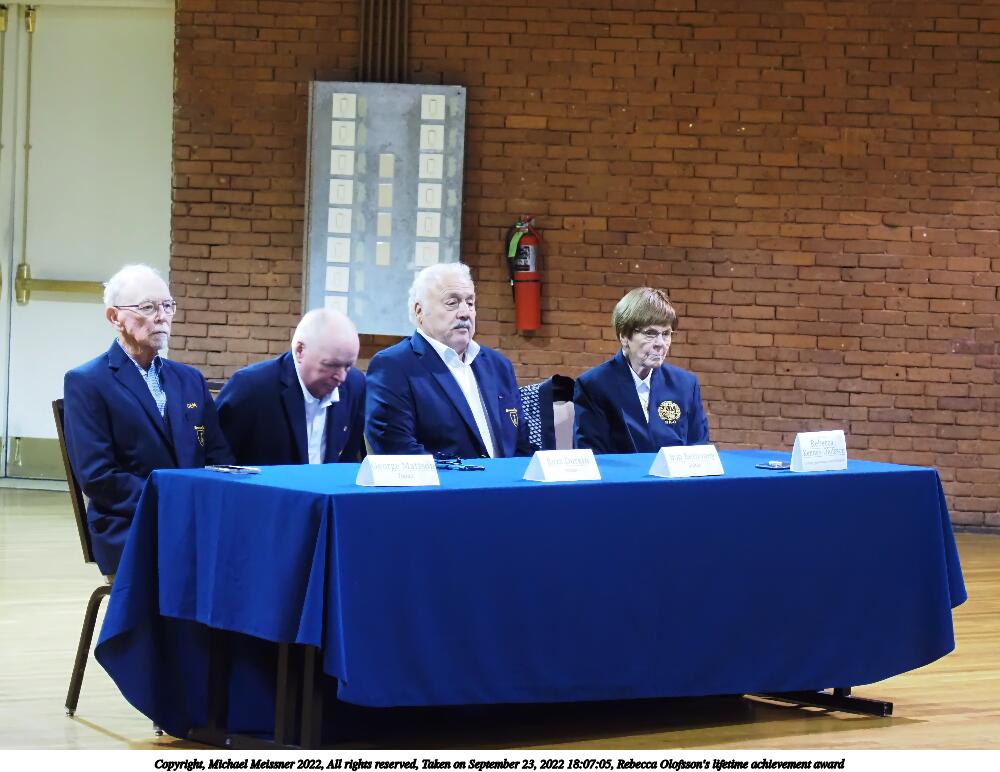 Picture #63: Rebecca Olofsson's lifetime achievement award 900x622, 98,454 bytes (97K), (html file) Copyright, Michael Meissner 2022, All rights reserved Olympus E-M5-III camera with Olympus 14-54mm-II f/2.8-3.5 lens f/3.5, ISO 5000, 1/100 sec, 41.0mm, auto mode, vivid color, matrix metering, IS Auto, face detection 35mm equivalent focal length 82.0mm Programs used: crop, gimp, raw therapee Taken by Michael Meissner on September 23, 2022 18:04:46 Last modified on November 06, 2022 at 12:22 |