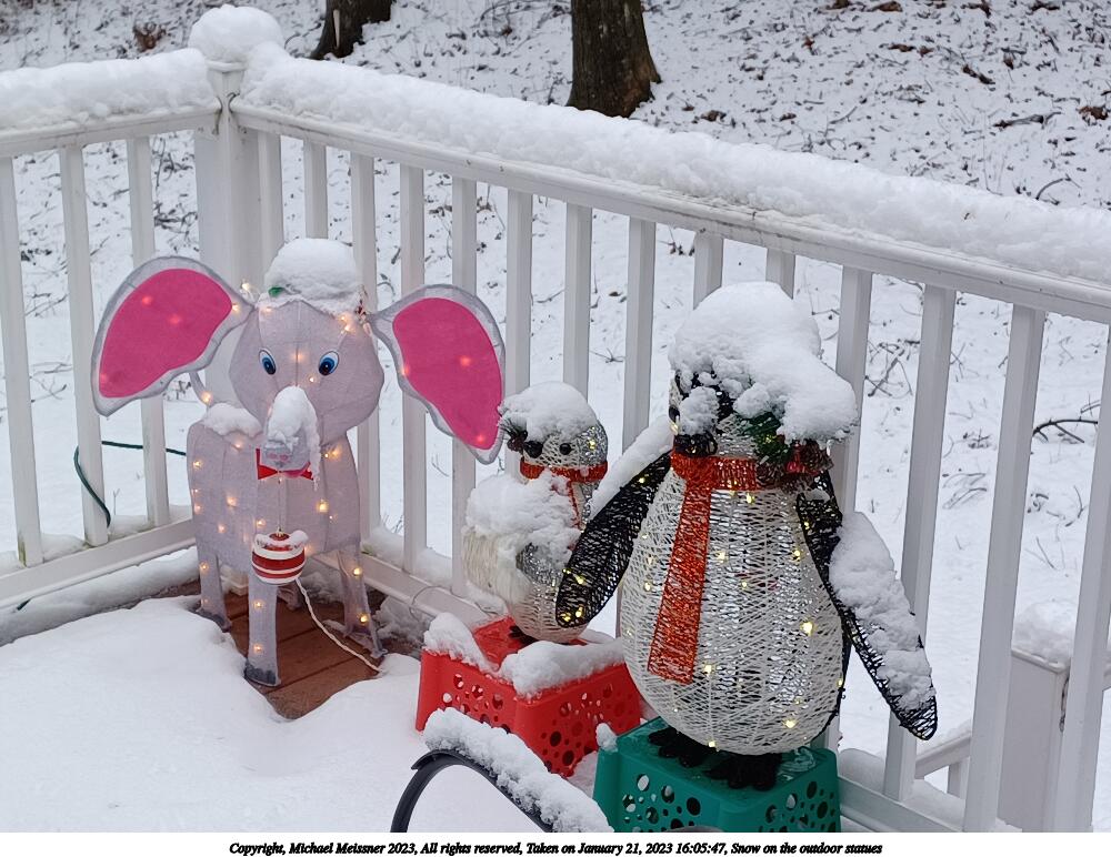 Picture #11: Snow on the outdoor statues 1000x772, 141,040 bytes (138K), (html file) Copyright, Michael Meissner 2023, All rights reserved Samsung A32 5G phone f/1.8, ISO 100, 1/60 sec, 4.6mm, auto mode, center weight metering, digital zoom x2.39 35mm equivalent focal length 60.0mm, digital zoom x2.39 Taken by Michael Meissner on January 21, 2023 16:05:47 Last modified on January 21, 2023 at 18:26 |