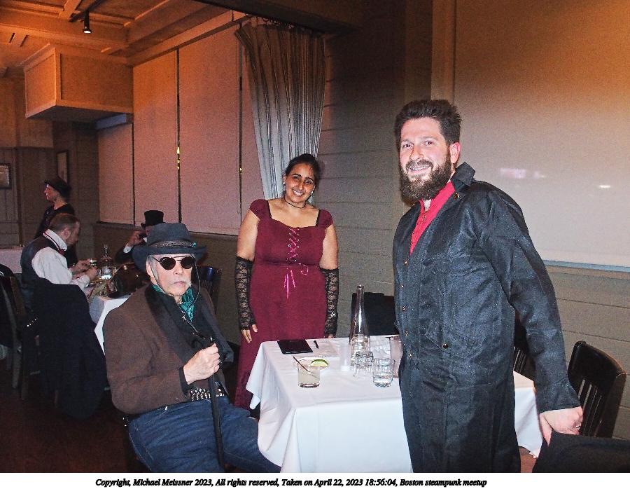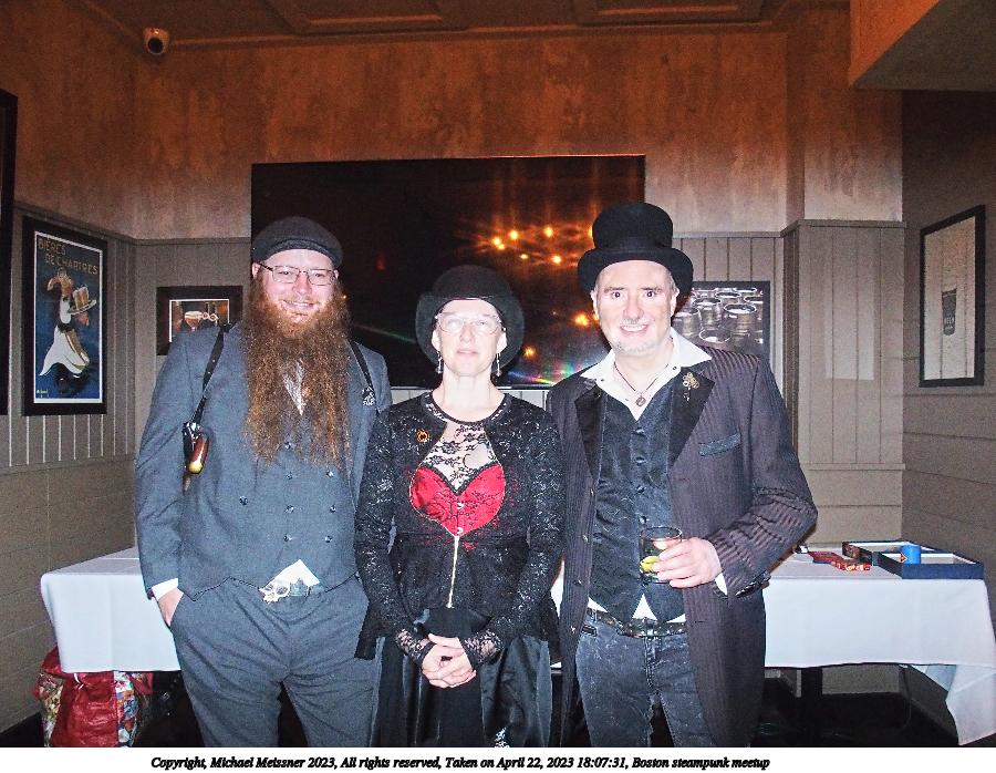 Picture #6: Boston steampunk meetup #4 Thumb: 400x300, 36,884 bytes (37K) Small: 900x698, 122,945 bytes (121K), (html file) Copyright, Michael Meissner 2023, All rights reserved Olympus Stylus-1 camera f/2.8, ISO 800, flash, 1/30 sec, 6.0mm, auto mode, natural color, center weight metering, IS Auto, noise reduction auto 35mm equivalent focal length 28.0mm Programs used: crop, raw therapee Taken by Michael Meissner on April 22, 2023 18:56:04 Last modified on May 20, 2023 at 20:54 |