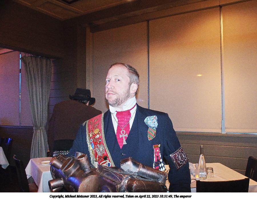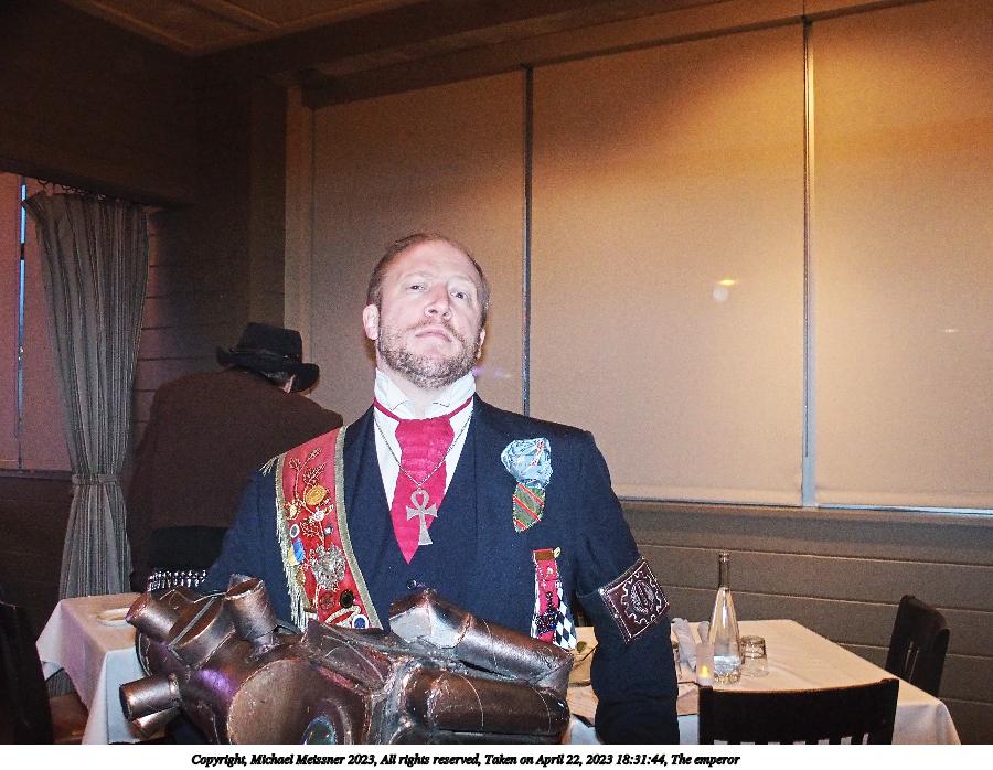 Picture #3: The emperor #2 Thumb: 400x300, 35,155 bytes (35K) Small: 900x698, 118,765 bytes (116K), (html file) Copyright, Michael Meissner 2023, All rights reserved Olympus Stylus-1 camera f/2.8, ISO 800, flash, 1/30 sec, 6.0mm, auto mode, natural color, center weight metering, IS Auto, noise reduction auto 35mm equivalent focal length 28.0mm Programs used: crop, raw therapee Taken by Michael Meissner on April 22, 2023 18:31:49 Last modified on May 20, 2023 at 20:54 |