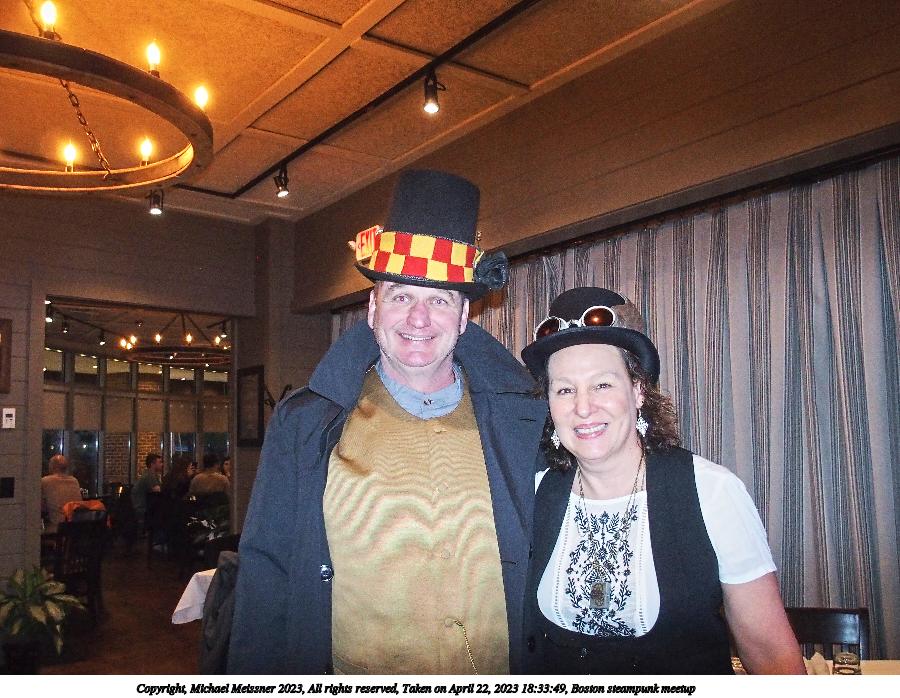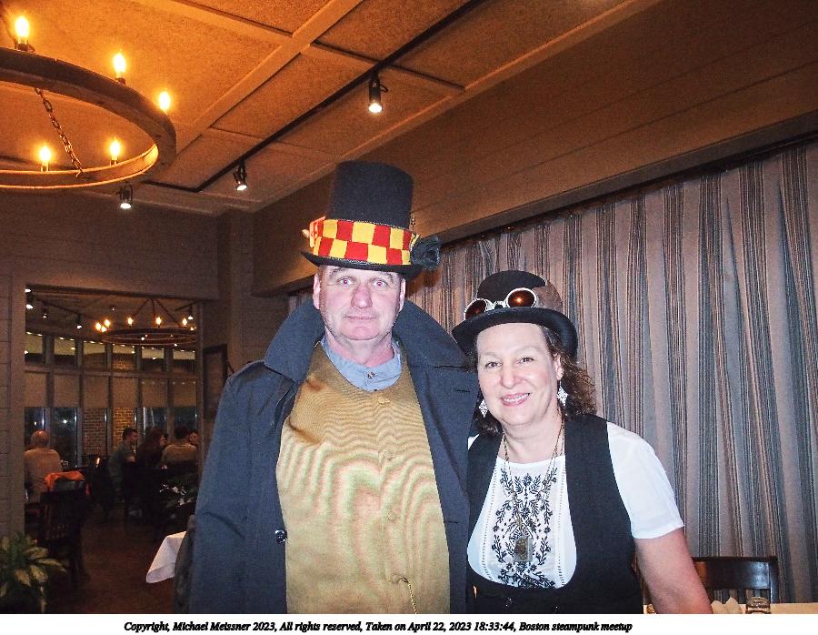 Picture #5: Boston steampunk meetup #3 Thumb: 400x300, 39,209 bytes (39K) Small: 900x698, 137,810 bytes (135K), (html file) Copyright, Michael Meissner 2023, All rights reserved Olympus Stylus-1 camera f/2.8, ISO 800, flash, 1/30 sec, 6.0mm, auto mode, natural color, center weight metering, IS Auto, noise reduction auto 35mm equivalent focal length 28.0mm Programs used: crop, raw therapee Taken by Michael Meissner on April 22, 2023 18:33:49 Last modified on May 20, 2023 at 20:54 |