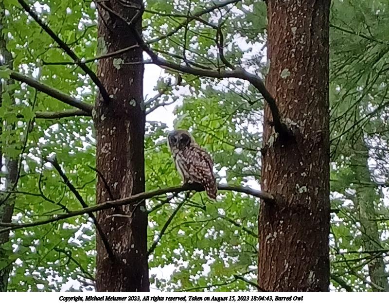 Picture #1: Barred Owl 800x623, 137,643 bytes (135K), (html file) Copyright, Michael Meissner 2023, All rights reserved Samsung A32 5G phone f/1.8, ISO 160, 1/60 sec, 4.6mm, auto mode, spot metering, digital zoom x2.19 35mm equivalent focal length 55.0mm, digital zoom x2.19 Programs used: gimp, rotate right Taken by Michael Meissner on August 15, 2023 18:04:43 Last modified on August 19, 2023 at 19:12 |