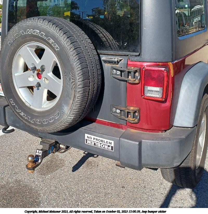 Picture #126: Jeep bumper sticker 800x823, 182,307 bytes (179K), (html file) Copyright, Michael Meissner 2023, All rights reserved Samsung A32 5G phone f/1.8, ISO 32, 1/287 sec, 4.6mm, auto mode, spot metering 35mm equivalent focal length 25.0mm Programs used: gimp, rotate right Taken by Michael Meissner on October 02, 2023 15:06:39 Last modified on October 04, 2023 at 07:45 |