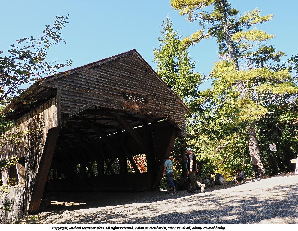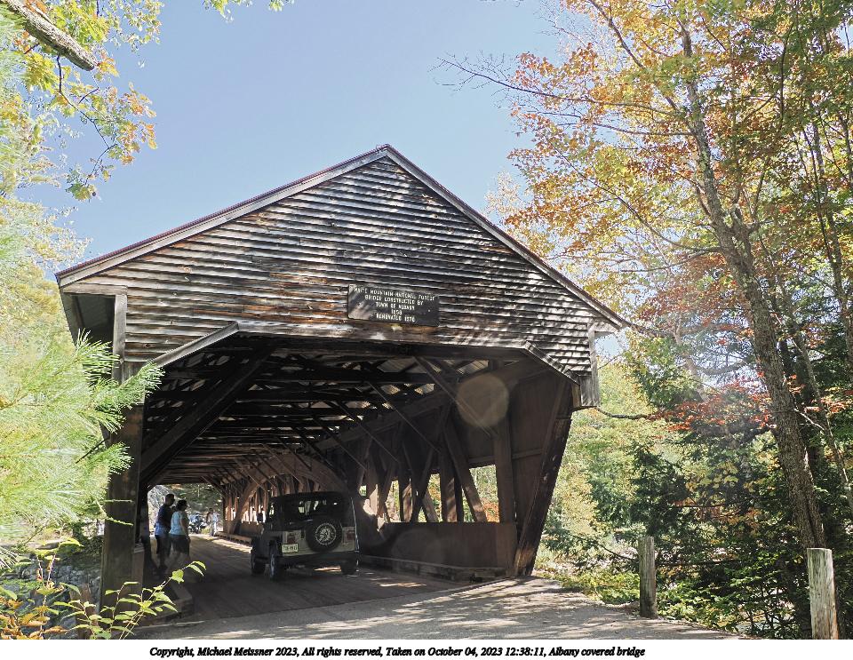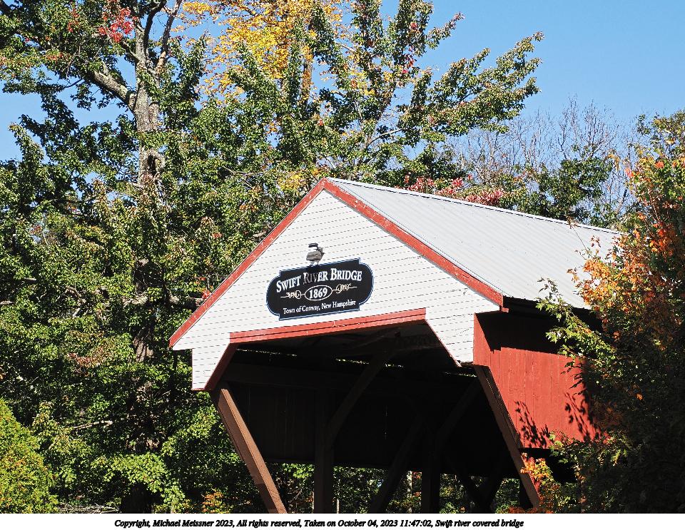 Picture #113: Swift river covered bridge #4 960x743, 314,337 bytes (307K), (html file) Copyright, Michael Meissner 2023, All rights reserved OM OM1 camera with Olympus-m43 12-200mm f/3.5-6.3 lens f/6.3, ISO 200, 1/400 sec, 12.0mm, auto mode, vivid color, matrix metering, continous focus, IS Auto 35mm equivalent focal length 24.0mm Programs used: crop, raw therapee Taken by Michael Meissner on October 04, 2023 12:27:34 Last modified on October 07, 2023 at 18:53 This picture is one of my favorites. |
