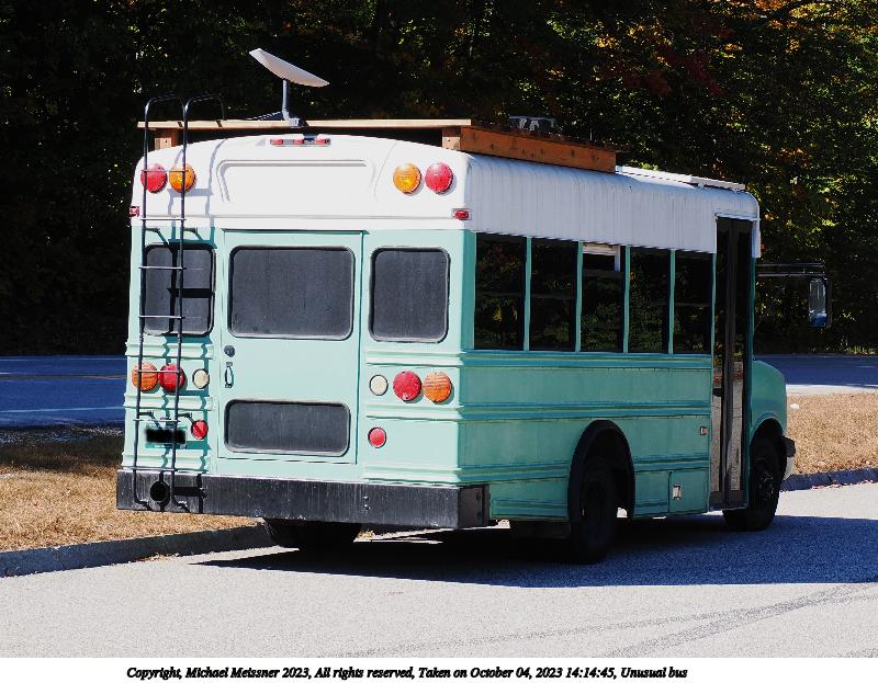 Picture #73: Unusual bus 800x623, 127,871 bytes (125K), (html file) Copyright, Michael Meissner 2023, All rights reserved OM OM1 camera with Olympus-m43 12-200mm f/3.5-6.3 lens f/7.1, ISO 200, 1/250 sec, 37.0mm, auto mode, vivid color, matrix metering, continous focus, IS Auto, anti-shock 35mm equivalent focal length 74.0mm Programs used: crop, gimp, raw therapee Taken by Michael Meissner on October 04, 2023 14:14:45 Last modified on October 07, 2023 at 22:59 |