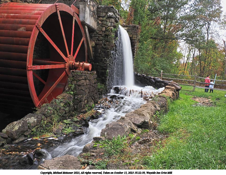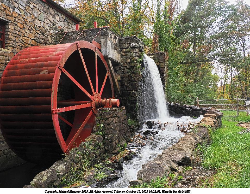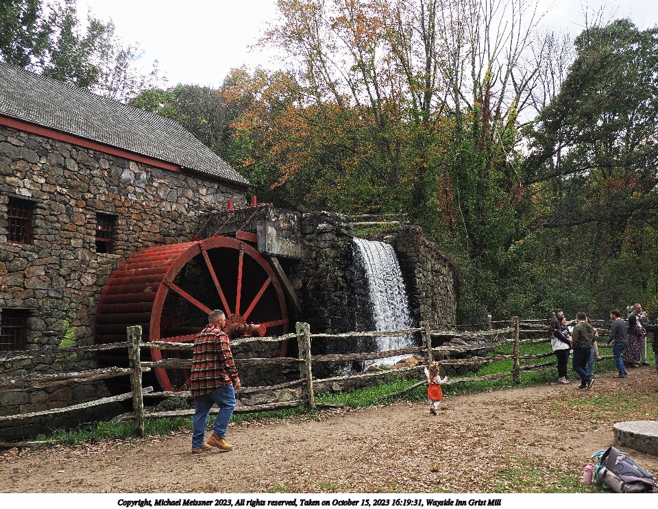 Picture #49: Wayside Inn Grist Mill #3 960x743, 284,480 bytes (278K), (html file) Copyright, Michael Meissner 2023, All rights reserved OM OM1 camera with Olympus-m43 12-200mm f/3.5-6.3 lens f/7.1, ISO 200, 1/40 sec, 14.0mm, shutter priority, vivid color, matrix metering, bias -1.0, continous focus, IS Auto, anti-shock 35mm equivalent focal length 28.0mm Programs used: crop, raw therapee Taken by Michael Meissner on October 15, 2023 16:22:02 Last modified on October 29, 2023 at 20:31 This picture is one of my favorites. |