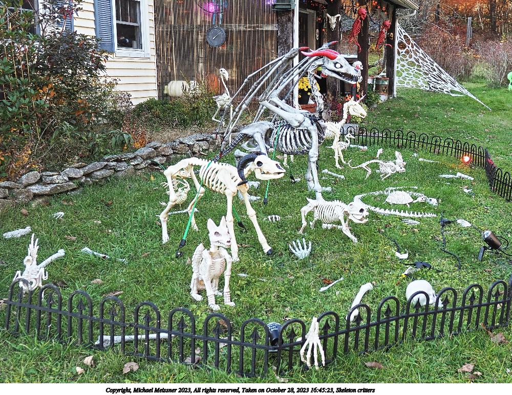 Picture #5: Skeleton critters #3 960x743, 261,982 bytes (256K), (html file) Copyright, Michael Meissner 2023, All rights reserved Olympus E-M1-II camera with Sigma 16mm f/1.4 lens f/2.2, ISO 200, 1/160 sec, 16.0mm, auto mode, natural color, SHQ, matrix metering, continous focus, IS Auto, both eyes priority, face detection, anti-shock 35mm equivalent focal length 32.0mm Programs used: crop Taken by Michael Meissner on October 28, 2023 16:51:50 Last modified on October 30, 2023 at 02:53 |