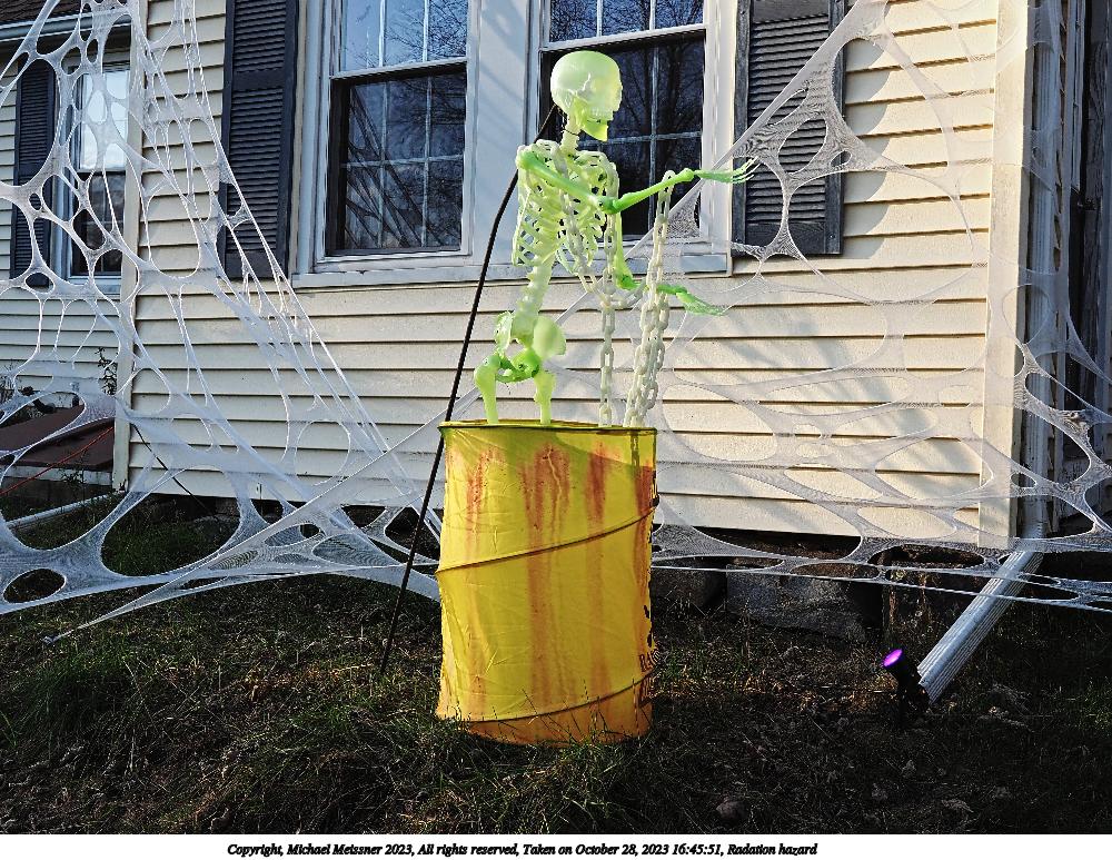 Picture #22: Radation hazard 1000x773, 245,121 bytes (240K), (html file) Copyright, Michael Meissner 2023, All rights reserved Olympus E-M1-II camera with Sigma 16mm f/1.4 lens f/4.0, ISO 200, 1/500 sec, 16.0mm, auto mode, natural color, SHQ, matrix metering, continous focus, IS Auto, both eyes priority, face detection 35mm equivalent focal length 32.0mm Programs used: crop, gimp, raw therapee Taken by Michael Meissner on October 28, 2023 16:45:51 Last modified on October 30, 2023 at 02:42 |