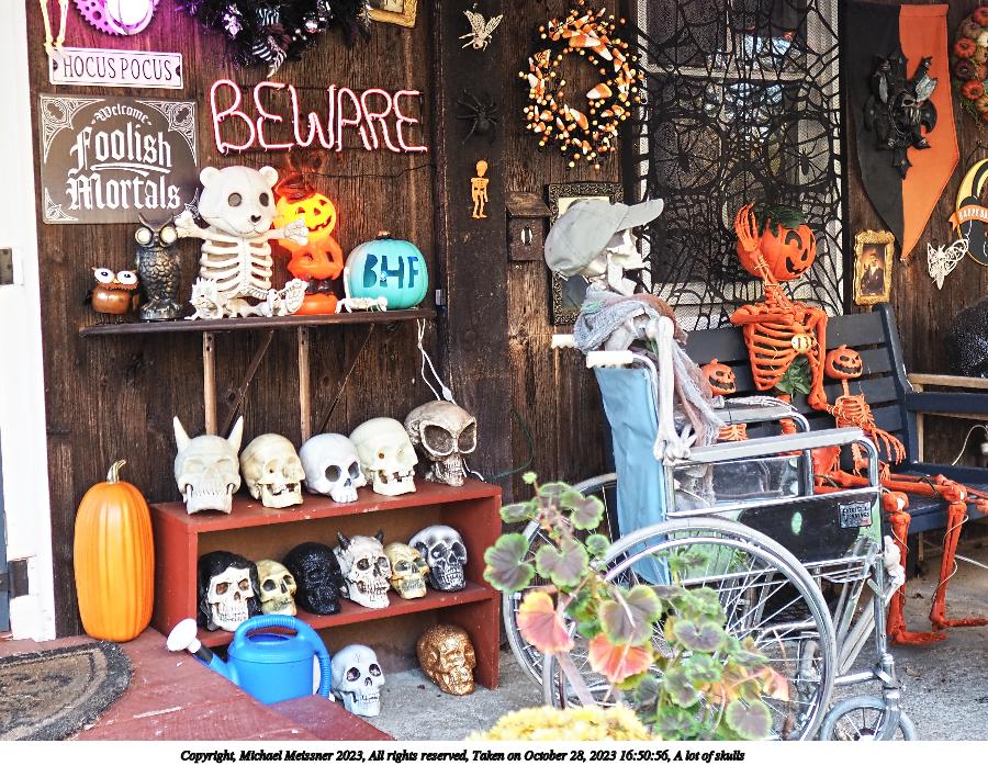 Picture #9: A lot of skulls 900x698, 210,844 bytes (206K), (html file) Copyright, Michael Meissner 2023, All rights reserved Olympus E-M1-II camera with Sigma 16mm f/1.4 lens f/1.6, ISO 200, 1/80 sec, 16.0mm, auto mode, natural color, SHQ, matrix metering, continous focus, IS Auto, both eyes priority, face detection, anti-shock 35mm equivalent focal length 32.0mm Programs used: crop, raw therapee Taken by Michael Meissner on October 28, 2023 16:50:56 Last modified on October 30, 2023 at 02:49 |