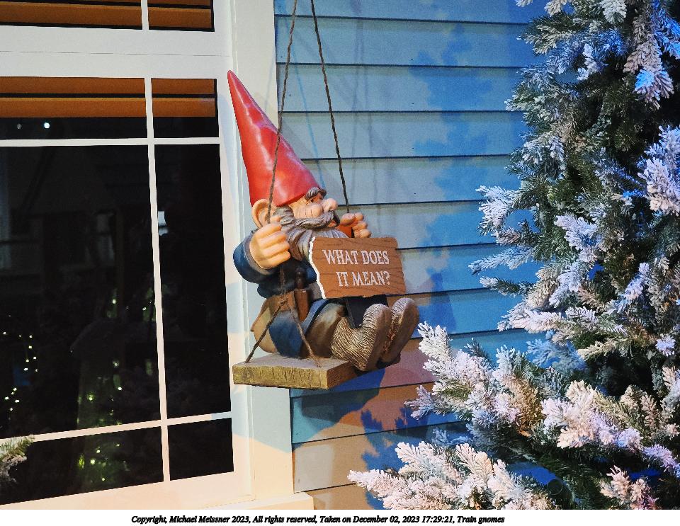 Picture #107: Train gnomes #2 960x743, 186,846 bytes (183K), (html file) Copyright, Michael Meissner 2023, All rights reserved OM OM1 camera with Olympus-m43 12-40mm f/2.8 lens f/2.8, ISO 8000, 1/125 sec, 31.0mm, auto mode, vivid color, matrix metering, continous focus, IS Auto, anti-shock 35mm equivalent focal length 62.0mm Programs used: crop, raw therapee Taken by Michael Meissner on December 02, 2023 17:29:21 Last modified on December 22, 2023 at 00:39 |