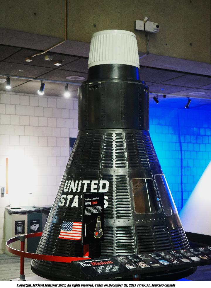 Picture #85: Mercury capsule 720x983, 133,237 bytes (131K), (html file) Copyright, Michael Meissner 2023, All rights reserved OM OM1 camera with Olympus-m43 12-40mm f/2.8 lens f/2.8, ISO 6400, 1/125 sec, 26.0mm, auto mode, vivid color, matrix metering, continous focus, IS Auto, anti-shock 35mm equivalent focal length 52.0mm Programs used: crop, raw therapee, rotate left Taken by Michael Meissner on December 02, 2023 17:49:51 Last modified on December 22, 2023 at 00:55 |