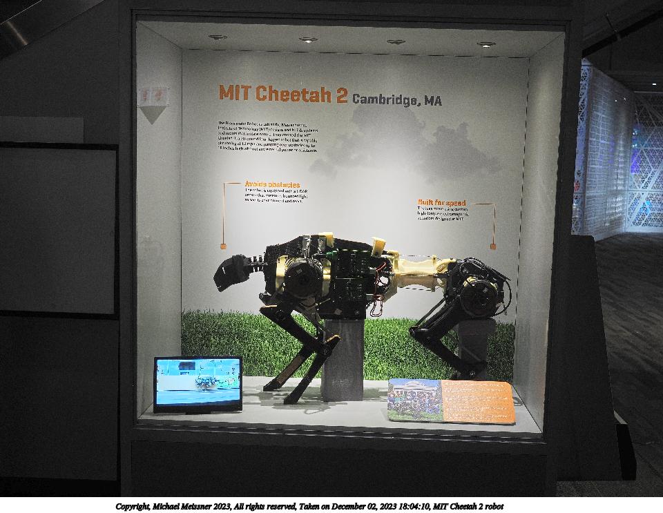 Picture #38: MIT Cheetah 2 robot 960x743, 135,328 bytes (133K), (html file) Copyright, Michael Meissner 2023, All rights reserved OM OM1 camera with Olympus-m43 12-40mm f/2.8 lens f/2.8, ISO 400, 1/125 sec, 20.0mm, auto mode, vivid color, matrix metering, bias -0.3, continous focus, IS Auto, anti-shock 35mm equivalent focal length 40.0mm Programs used: crop, raw therapee Taken by Michael Meissner on December 02, 2023 18:04:10 Last modified on December 23, 2023 at 02:28 |