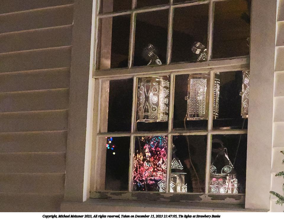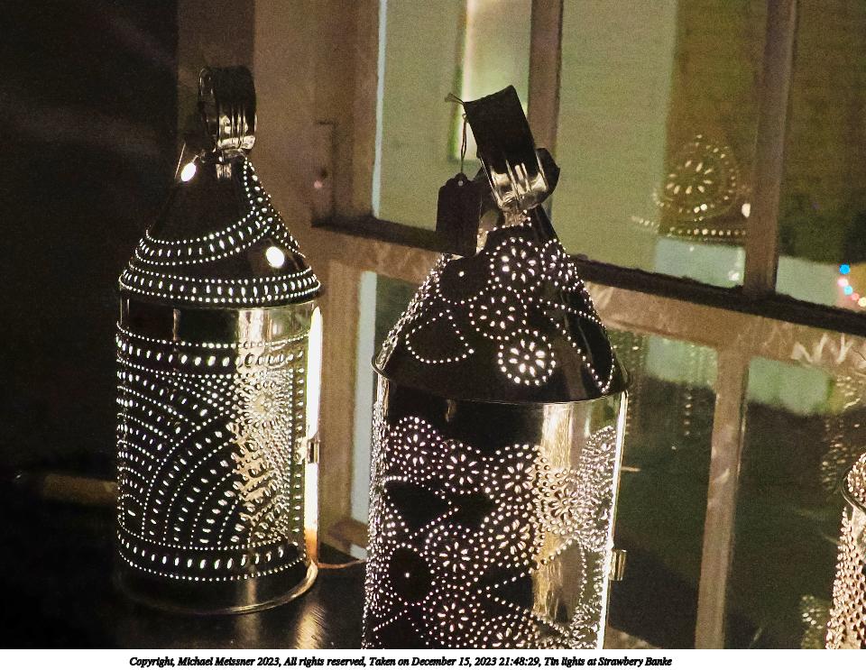 Picture #3: Tin lights at Strawbery Banke 960x743, 144,667 bytes (142K), (html file) Copyright, Michael Meissner 2023, All rights reserved OM OM1 camera with Olympus-m43 12-40mm f/2.8 lens f/2.8, ISO 12800, 1/80 sec, 27.0mm, auto mode, vivid color, matrix metering, digital zoom x2, continous focus, IS Auto, anti-shock 35mm equivalent focal length 108.0mm, digital zoom x2 Programs used: crop, raw therapee Taken by Michael Meissner on December 15, 2023 21:47:05 Last modified on December 24, 2023 at 21:24 |