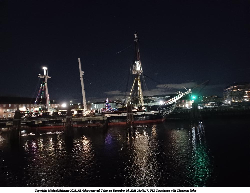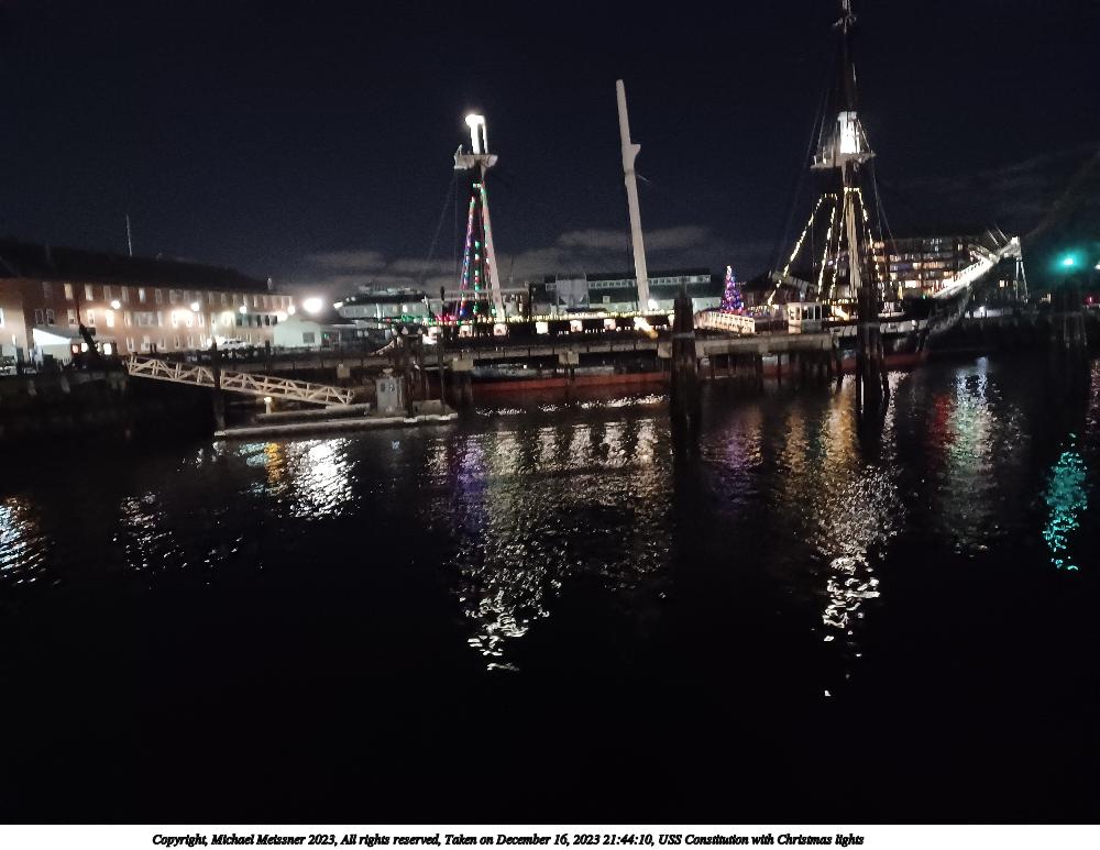Picture #122: USS Constitution with Christmas lights #2 1000x773, 102,231 bytes (100K), (html file) Copyright, Michael Meissner 2023, All rights reserved Samsung A32 5G phone f/1.8, ISO 4000, 1/10 sec, 4.6mm, auto mode, center weight metering 35mm equivalent focal length 25.0mm Programs used: rotate right Taken by Michael Meissner on December 16, 2023 21:44:33 Last modified on December 18, 2023 at 21:13 |