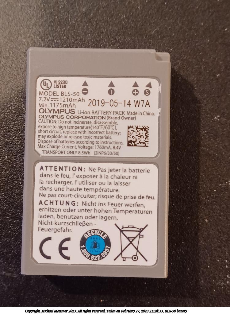 Picture #30: BLS-50 battery 750x1023, 130,196 bytes (128K), (html file) Copyright, Michael Meissner 2023, All rights reserved Samsung A32 5G phone f/1.8, ISO 1600, 1/15 sec, 4.6mm, auto mode, center weight metering, digital zoom x2 35mm equivalent focal length 50.0mm, digital zoom x2 Programs used: rotate right Taken by Michael Meissner on February 27, 2023 21:26:33 Last modified on May 20, 2023 at 20:27 |