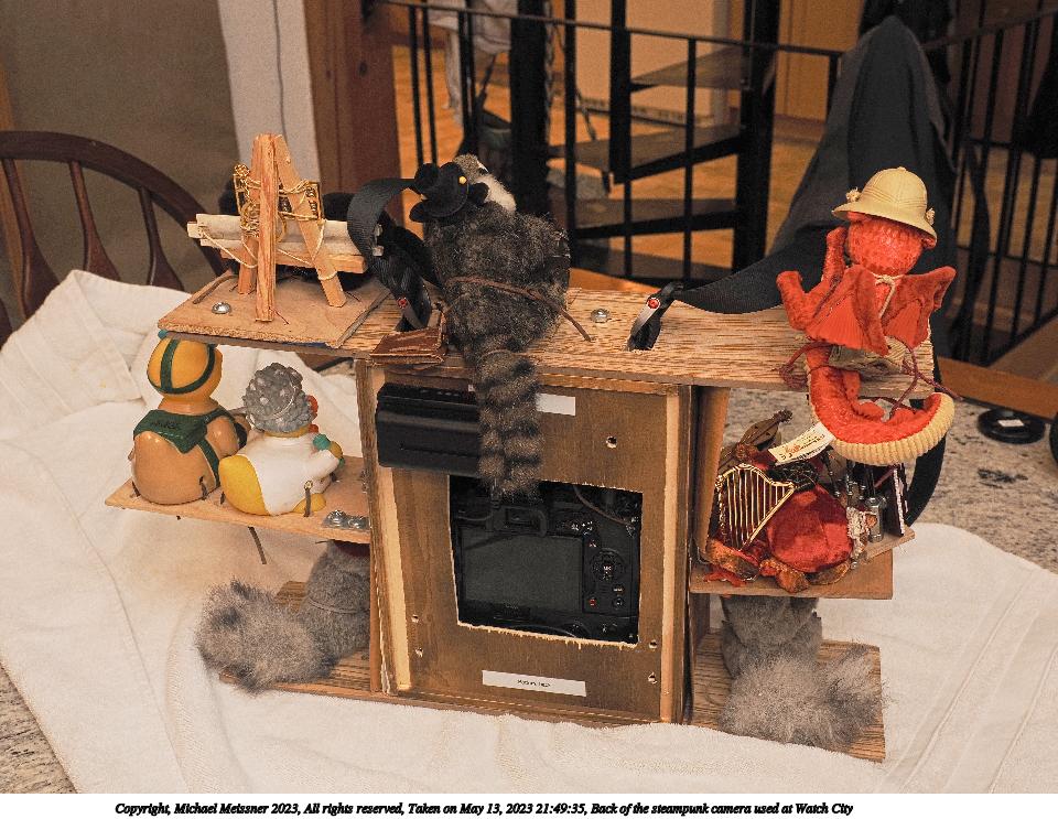 Picture #21: Back of the steampunk camera used at Watch City 960x743, 164,224 bytes (161K), (html file) Copyright, Michael Meissner 2023, All rights reserved OM OM1 camera with Olympus-m43 12-40mm f/2.8 lens f/5.6, ISO 1000, flash, 1/60 sec, 19.0mm, aperture priority, vivid color, matrix metering, IS Auto, anti-shock 35mm equivalent focal length 38.0mm Programs used: crop, gimp, raw therapee Taken by Michael Meissner on May 13, 2023 21:49:35 Last modified on May 20, 2023 at 20:27 |