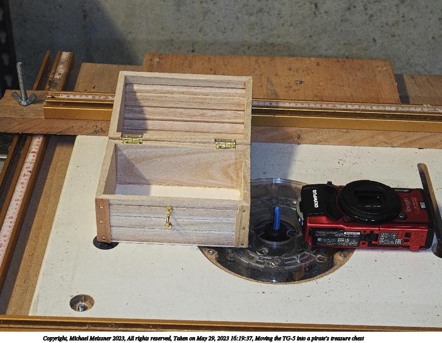 Picture #12: Moving the TG-5 into a pirate's treasure chest 900x698, 132,208 bytes (130K), (html file) Copyright, Michael Meissner 2023, All rights reserved Olympus Stylus-1 camera f/2.8, ISO 400, flash, 1/60 sec, 13.2mm, auto mode, natural color, center weight metering, IS Auto, noise reduction auto 35mm equivalent focal length 62.0mm Programs used: crop, raw therapee Taken by Michael Meissner on May 29, 2023 16:19:37 Last modified on June 24, 2023 at 22:29 |